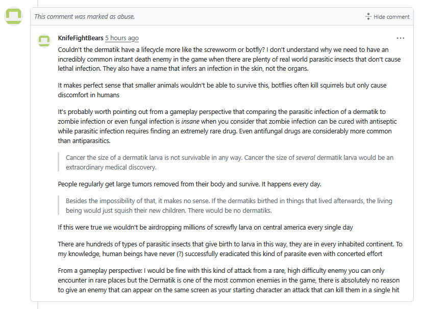 >>50339489 Чему тут удивляться, это буквально то что говорят Кевин и Эрк/Коргент последние годы. Должно быть реалистично, про то что должно быть еще и интересно договора не было. И ведь как бы против интересного гринда в песочницах и рогаликах никто не против, но хоть бы оно как-то в игровые механики вписывалось. Ну и эта последняя идея Эрка о том, что нпс должны обучать выживана скиллам, абстрактно звучит норм, но кто вообще в Кате играет с неписями которые дохнут как мухи без прокачки? и потом все равно умудряются сдохнуть как-то по глупому.