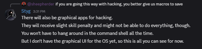 >>50349330 На самом деле тут просто нет ещё графического интерфейса у программы взлома. Можно будет просто тыкать кнопочки и оно там само всё будет делать в большинстве случаев. Только самые жёсткие системы надо будет ломать вручную. Ну и вроде как количество хакинга и локпикинга будет уменьшено, но с лучшей наградой.
