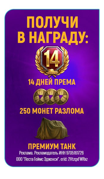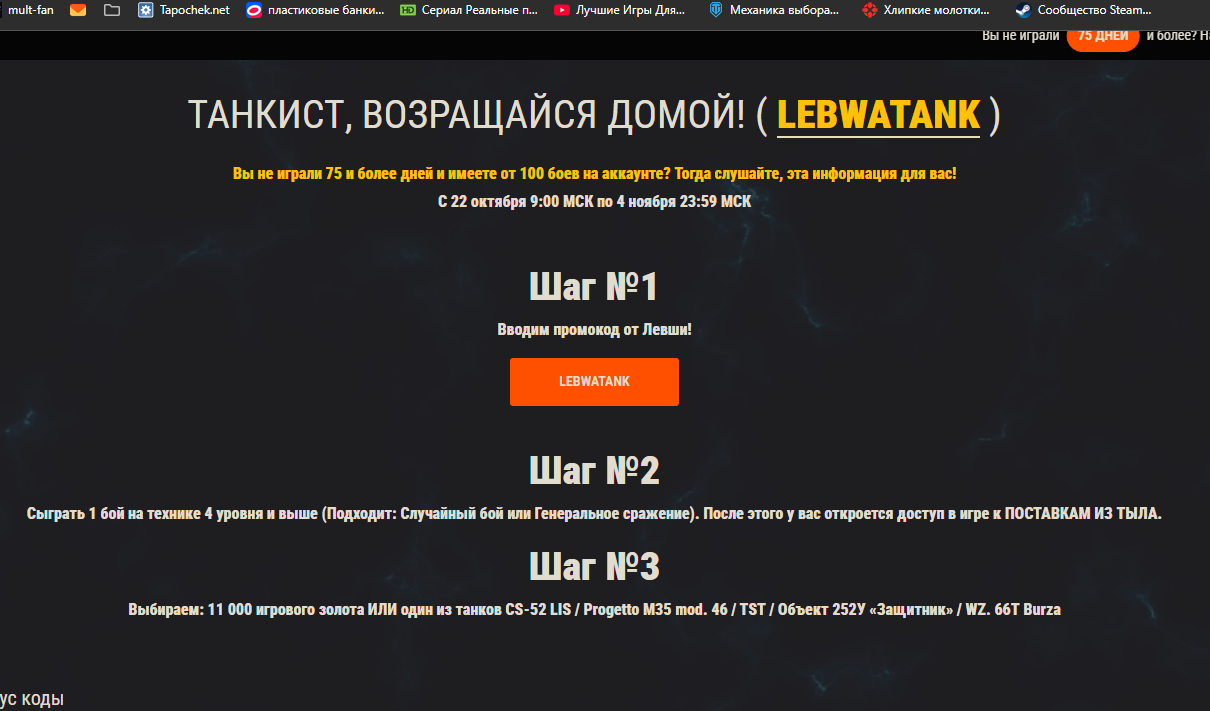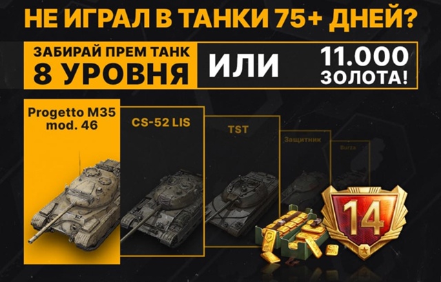 💰Выгодный возврат в игру по ссылке - https://lesta.ru/shop/redeem/?bonus_mode=YUSHATANK 1. "YUSHATANK" бонус-код с подарочным премиум танком на выбор за 1 бой в рандоме на танке от 4 уровня (выбирай CS-52 LIS, Progetto M35 mod. 46, TST, Объект 252У «Защитник», WZ. 66Т Burza или 11 000 Золота Мира танков), 14 дней премиум аккаунта и 250 монет события Разлом: если не играл 75 и более дней и есть 100 боев на акке!