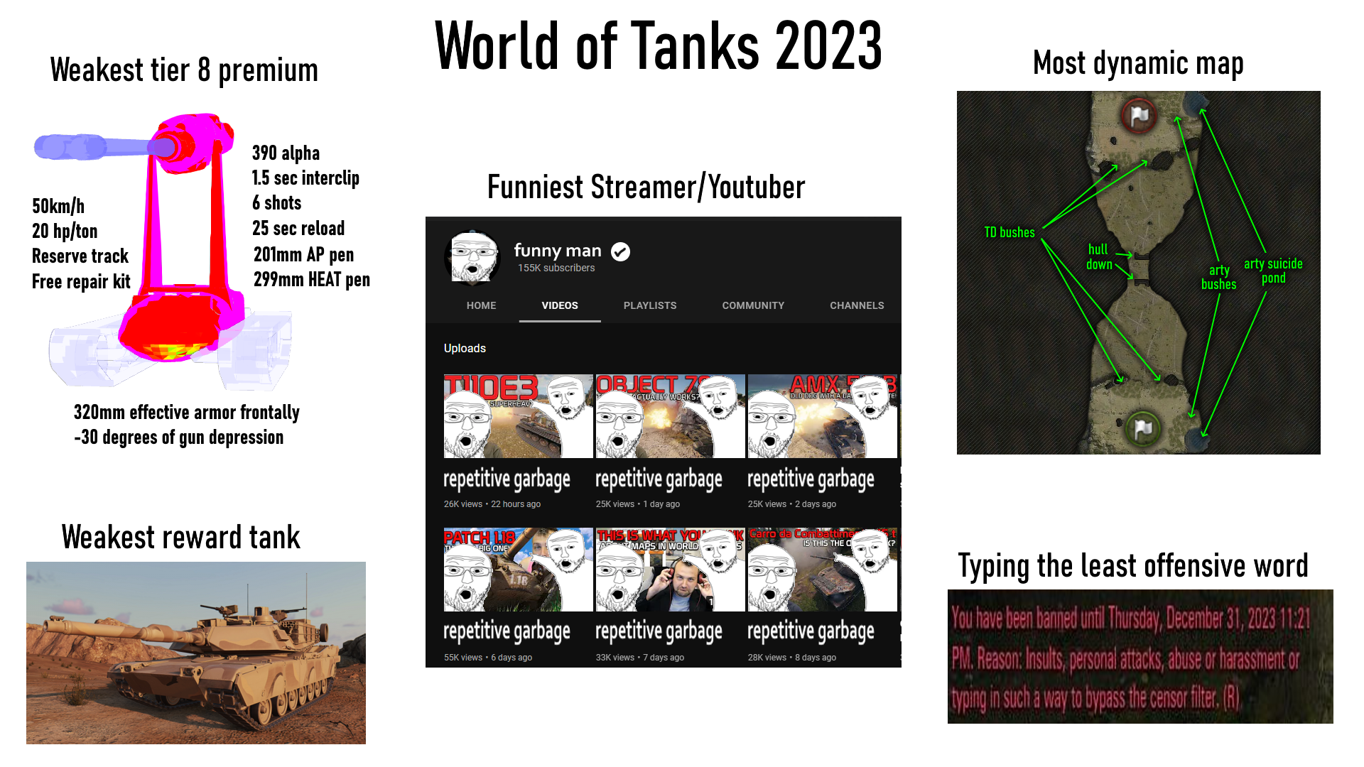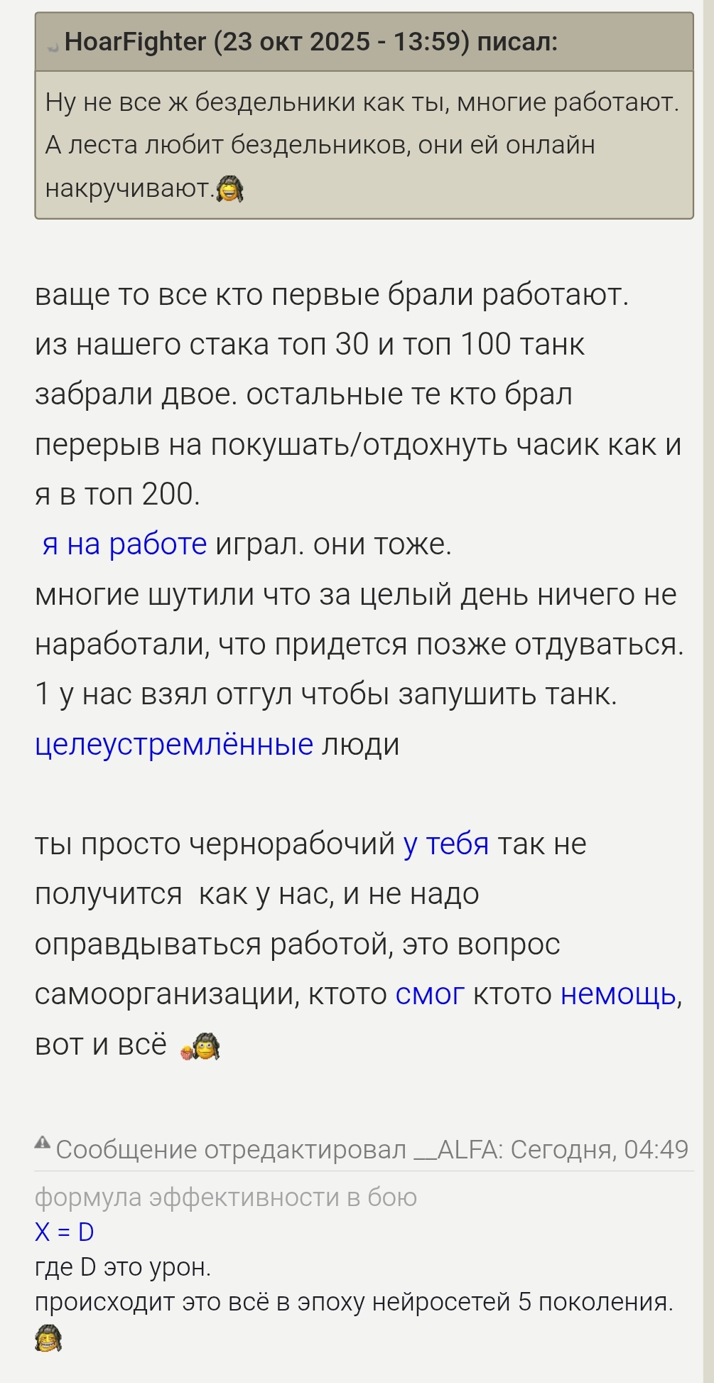 >>50359499 >ниже 2500 вн8 по плану никогда не выступлю Даже там может быть полное дно. По сути тут всего кланов 20, может быть 30 куда можно вступить, все остальное это дурка и все кто в кланах варился их знает, там составы не меняются почти десятилетиями. Клановая хуйня это отдельный вид искусства, а общение в нем, ммммммм. Не дай бог играть со стриммером, особенно медийным, вони будет от поражения ояебу. На десяток стриммеров две адекватные и обе тян. Шотник так вообще завизжал на весь дискорд от двух поражений при винрейте в 80% за два часа. Ни в одной другой онлайн игре не видел такой дурки. Лехи кстати иногда попадаются очень даже адекватные, но там буквально селекцией надо заниматься. >>50359511 >а кто-то нахуй всех пошлёт и всё испортит, даже зная что он полный ноль и абсолютно не шарит в теме Да вот хуй там. Танкист упертый шо баран. Ему совершенно поебать что у него 47%, а у того кто им командует 65%. Ему просто невозможно доказать его неправоту, он абсолютно уверен в том что именно его мнение верное.