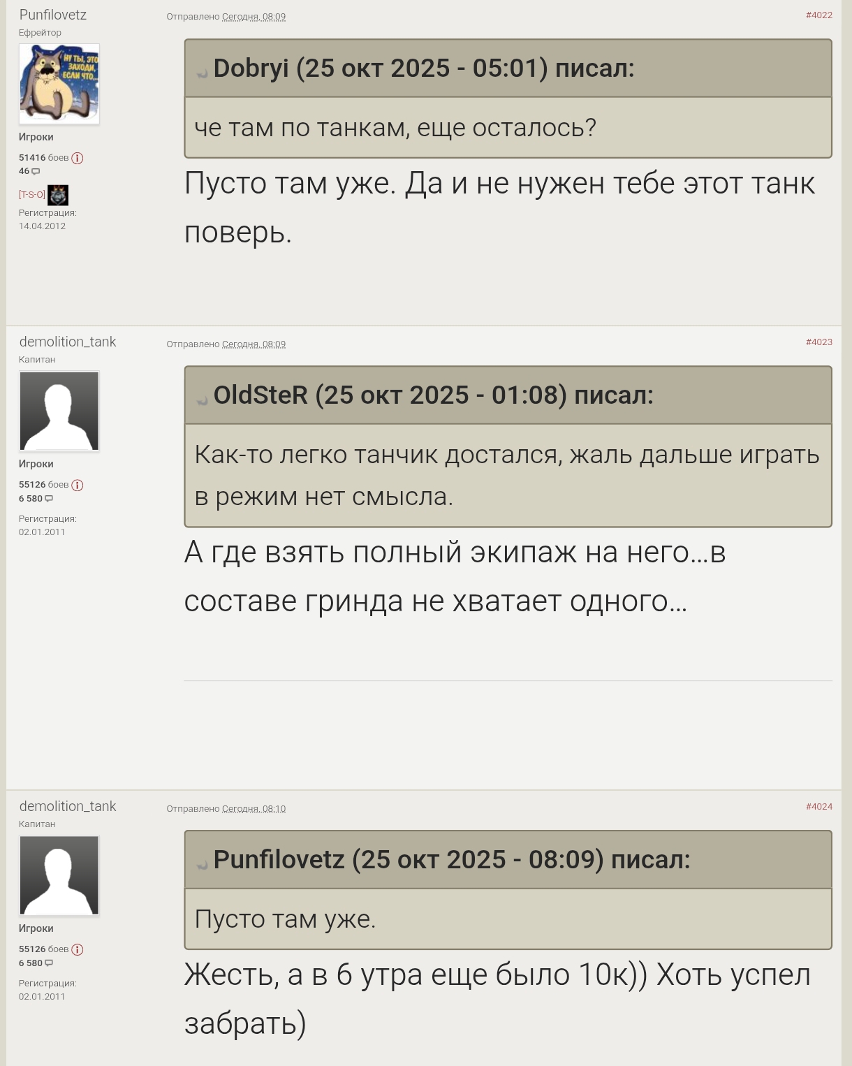 >>50347240 >а потом орать защо когда любимый дед из ангара исчезнет С танкистов бесконечно можно проигрывать. Помню была какая то хуета где за серу можно было прем 8 купить, танкисты побежали дриснятки продавать чтобы ставочку повыше задрать. Ну и получалось что ограничением на продажу танков выходило около 15 или 18кк серы. В итоге говноеды остались без дрисняток и према8. Ебать как же я орал читая раковый. В каждом слове, в каждом символе чувствовалась концентрированная ярость и обида танкистов. За это я и обожаю танки, таких дегенератов в других играх не может существовать.