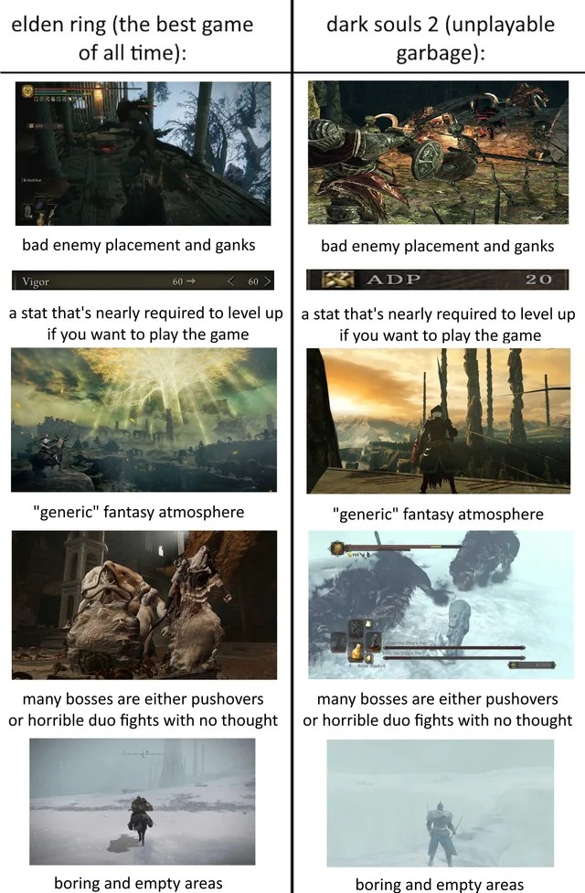 Забавная штука. Мне двуха с самого начала показалась какой-то не такой, было в ней что-то неправильное, инородное, не такое как раньше. До двухи я прошёл и однуху и демонов на плойке, а в двуху закатился уже на пк в 60 кадров. Моё ебало когда стартовый меч лопнул за ~10 ударов лучше не имаджинировать. Боссы показались мне хуйнёй уже тогда, что гигант, что преследователь, что четвёрка великих были просто кринжем и губками для урона. Кстати, я был уверен что если рубить гиганта по ногам, то он упадёт. Моё ебало когда гигант так и подох не упав можете не имагать. Хорошо что в бладике падения гигантов вернули, и в трёхе тоже. По лору тоже словил кучу непоняток и первые часы игры вообще не мог допереть что из этих обрывков разных историй есть центральная тема игры. А когда нащупал линию Веника и Нарашки, то был сразу сбит с толку боссом-жабой, Алдией, который до этого в лоре не появлялся, драконом и воспоминаниями гигантов. В общем закрыл я игру без малейшего понимания что произошло в Дранглике. Двуха в целом мне так и запомнилась, каким-то сырым огрызком с недописанной историей. А потом, спустя годы, я застал великую драму лорных войн и прочих приключений протыков. И оказалось в итоге, что мне тогда, в далёком 2014, нихуя не показалось. С игрой всё действительно очень не так.
