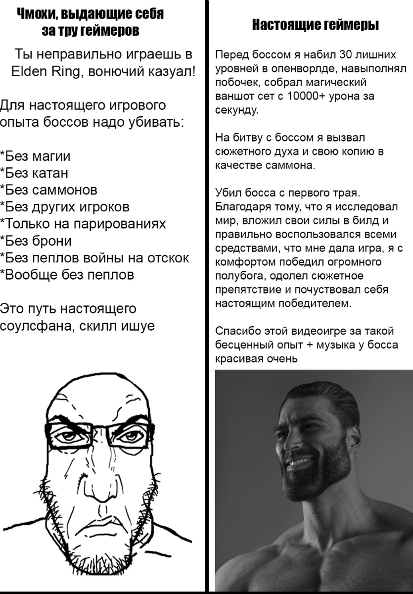 >>50457148 Так а к чему тогда претензии к элдену, если соулсы с нулевой секунды своего существования это перехайпанная параша для нормисов? >абсолютно никакого вызова не представляет уже на втором ране. Пффф, можно ли было спиздануть что-либо более нелепое? Эниуей, в чем претензии к стримеркам с ковриками, я так и не понял. Сам ты так не можешь очевидно, ну а тот факт о том что так многие делают должен говорить о чем? Что игра типо лёгкая? Ну так забросить можно что угодно, это не значит что это легко как бы. Ну и полно я думаю прохождений с ковриками боссов из дс. Да, может меньше чем к элде но только потому что элда популярнее. Почему популярнее? Потому что лучше во всем, очевидно. А вот ты зачем-то путаешь причину и следствие. Не то чтобы меня удивляло твое невежество, конечно. Короче очередное идиотское мнение в стиле популярно значит плохо лол