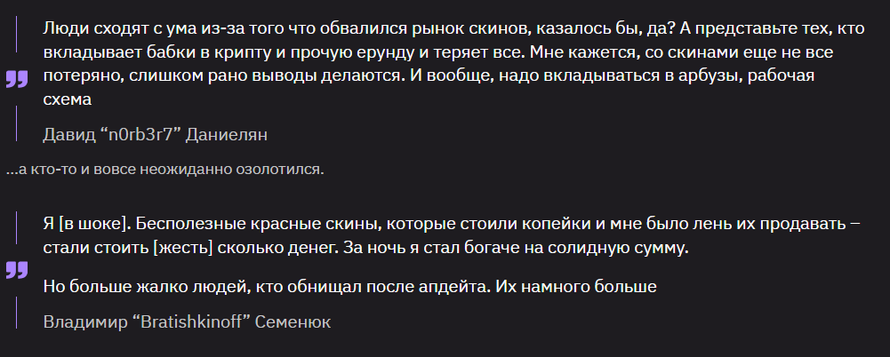 >В частности, китайский трейдер с ником Z по сути дошел до крайности в прямом эфире, сообщив перед концом, что он потерял более 20 тыс. долларов на обвале рынка. По неподтверждённым данным, в Китае зафиксировано не менее 15 подобных случаев среди молодых людей, многие из которых брали кредиты на спекуляции скинами в CS2, воспринимаемой как «крипта». Надеюсь среди двачеров нет таких дураков, чтобы из-за падения цены на картинки суицидиться. Все это мелочи. Может завтра вы выиграете гринку и свалите жить в Техас. И через годы будете вспоминать об этом обвале как о смешном курьезе.