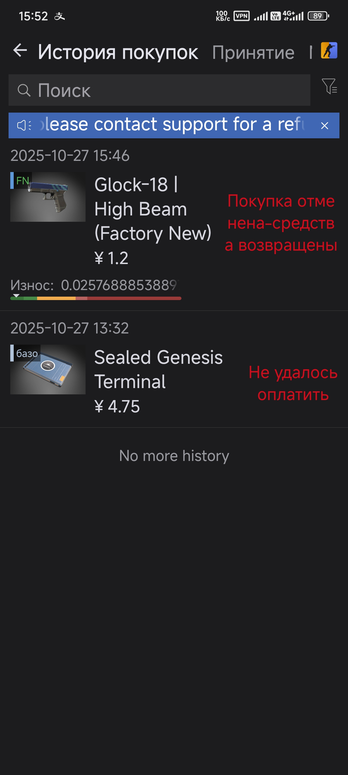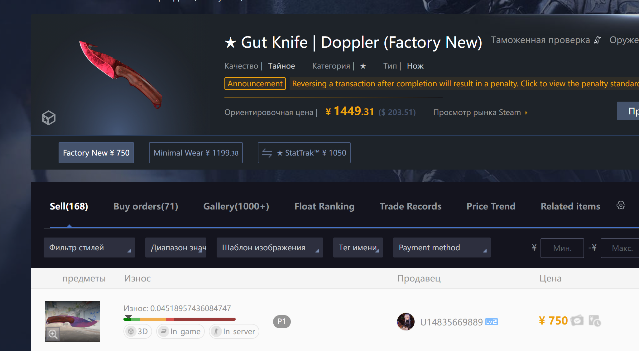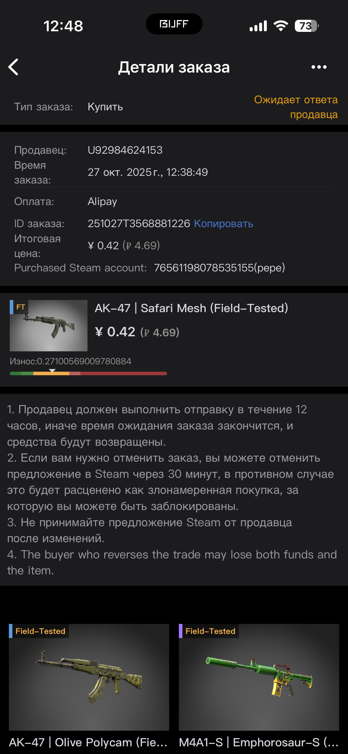 Данный скин находился в холде, после чего юзер, который нам его продал, сделал trade reverse. Вследствие этого сделка аннулирована. Средства зачислены на ваш баланс, просим прощения за предоставленные неудобства. Ладно анон был прав