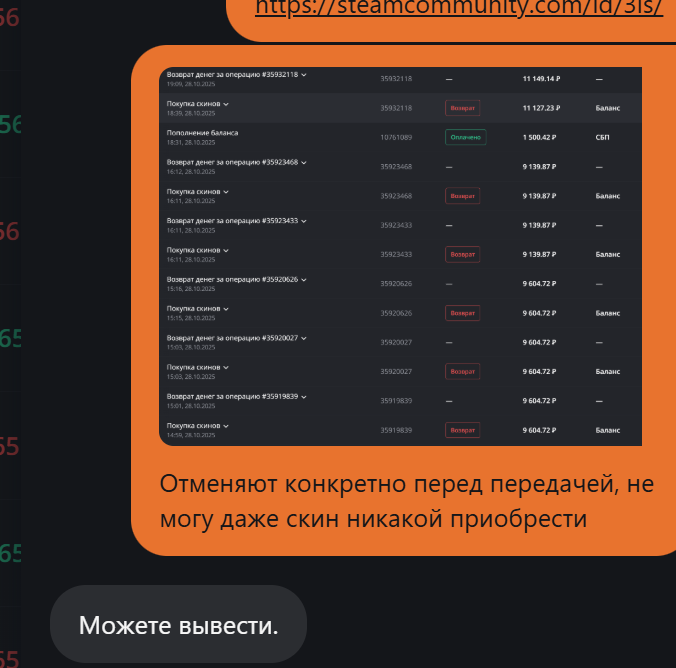 >>50371524 Могут не отправить трейд, деньги вернут через час~ Могут отправить трейд, и через несколько дней вернуть обмен, думаю бабки тоже вернут но хз когда, не сталкивался