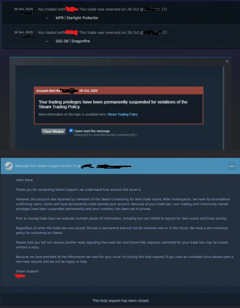 Автор поста пишет: "Вечером 26 октября я воспользовался защитой Steam для отмены сделок. Почти через два дня я получил уведомление на свой аккаунт о том, что я получил трейдбан навсегда. Что стало причиной? Люди, с которыми я торговал и которые были возмущены отменой сделки, оставили комментарии в моём профиле, что я их обманул, воспользовавшись механизмом обратной сделки Steam."