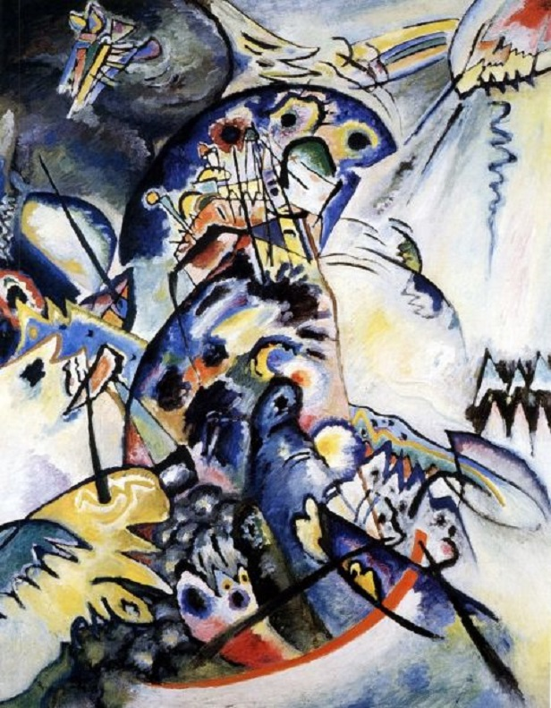 В созданной Кандинским в 1917 году работе «Синий гребень» вихреобразное струение, горение живописной «материи» является выражением душевного напряжения, мрачных предчувствий. Трагические ноты слышатся в переплетениях рваных чёрных линий, образующих каркас композиции. Необычайная цветовая экспрессия произведения подобна симфоническому звучанию во всей его полноте, силе и мощи. Полотно можно было бы описать как «вариации на тему синего цвета». Бесконечные оттенки синего проецируются на светлый фон, создавая впечатление спирального движения по синей дуге. Помимо глубокого звучания синего, которое можно сравнить со звучанием органа, в картине можно также услышать «пронзительные» тона штрихов желтого и красного, которые напоминают регистр трубы.