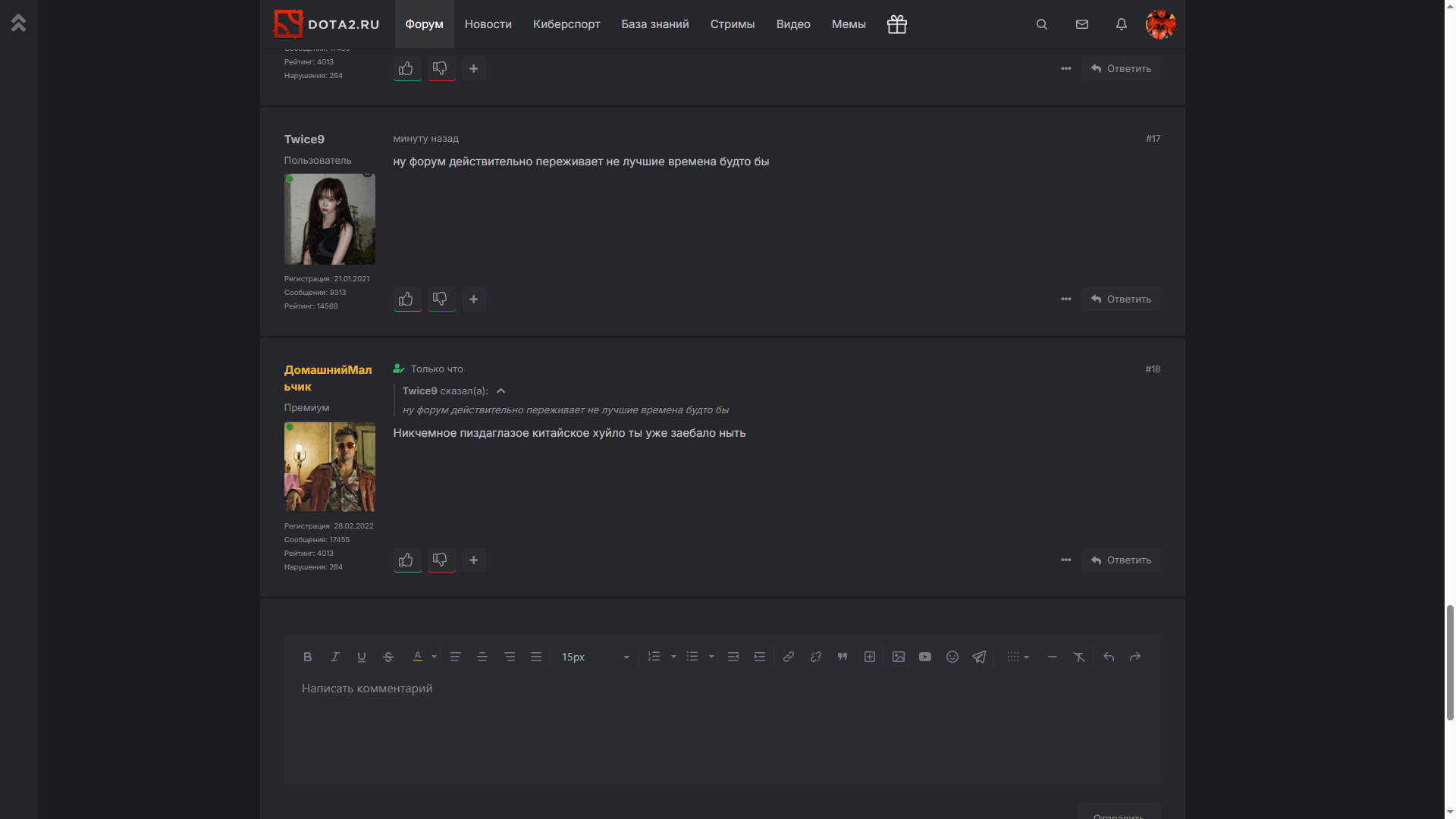 >>50446365 >Два.ч >норма 10 или 12 лет назад на волне всесторонней попытки Абу коммерциализировать эту ИБ-помойку такие слова можно бы было назвать справедливыми, но сегодня Два.ч - это не то что даже не VK-паблик, как было принято шутить примерно тогда же, в моменты, когда речь заходила о пресловутой норме, а просто помойка с из домессенджеровой и дотиктокошортсорилсовой эпохи с отщепенцами всех мастей и возрастов. Даже в такой игре как Дота из нормы остались только вспоминающие юность заводчане с орущими на фоне детьми. ZXC-школьники же в массе своей нормой не являются, т.к. по сути это самые первые кандидаты на становление Двачером.