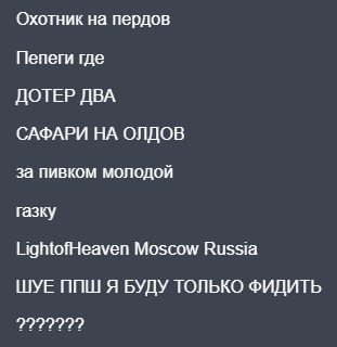 чо за хуерлыга пробитая тут сама с собой общается ни одного слова про доту, шизу свою высирает, АЛО ХУЕСОС ПИЗДАК ВАЛЬНИ НАХУЙ СВОЙ ИЛИ Я ТЕБЕ ГОЛОВУ ПИЛОЙ ОТРЕЖУ НАХУЙ