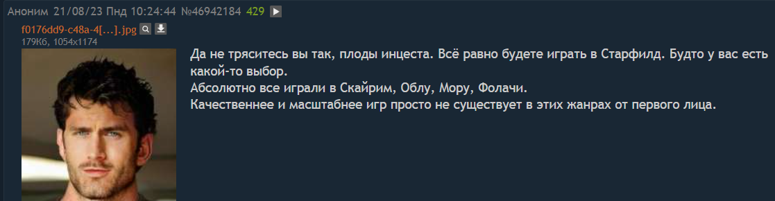 >>50373515 Хз даже, тоддлер там со времён арены и даггерфола. Правда, его идеи явно исчерпали себя уже после Обливиона, повезло ещё, что Скайрим хорошо приняли. Но пилить одно и то же 30 лет - такое себе, это ж вам не кс сессионный. Глянем шестые свитки, мб и уйдет на пенсию пацан, если продукт получит такие 56% положительных отзывов, как и стоунфилд.