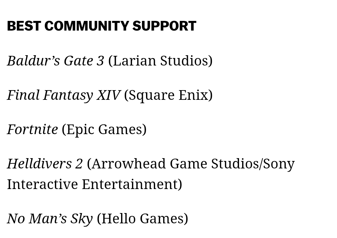 >>50459650 >Recognizing a game for outstanding community support, transparency and responsiveness, inclusive of social media activity and game updates/patches Тут вообще без шансов.