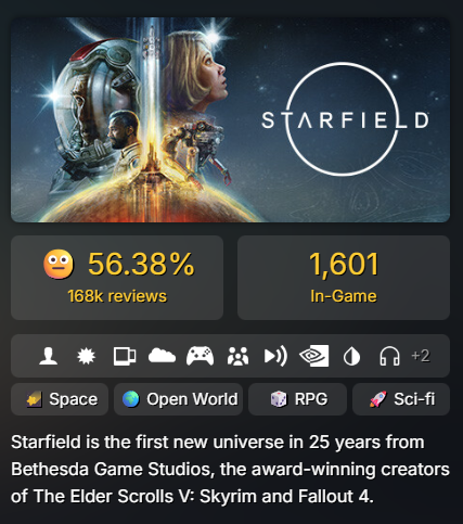 Просто смотришь в Стиме на онлайн Старкалыча и сразу всё становится понятно: никому ненужный старкалыч, даже мододелам нахуй не усрался выкидышь карлика-дилетанта Тодда. Амбиции, грезы карлика об "эпичной космической rpg", в итоге - пук! бздюююх!!.