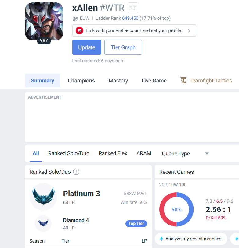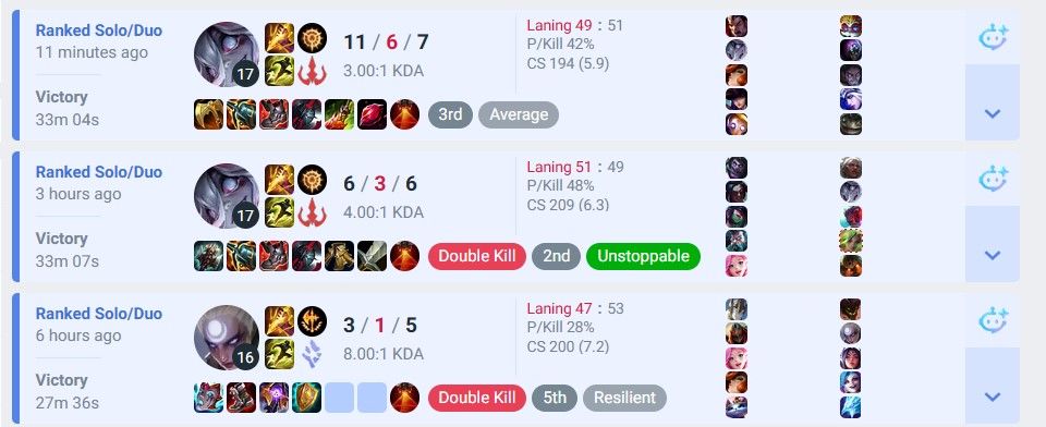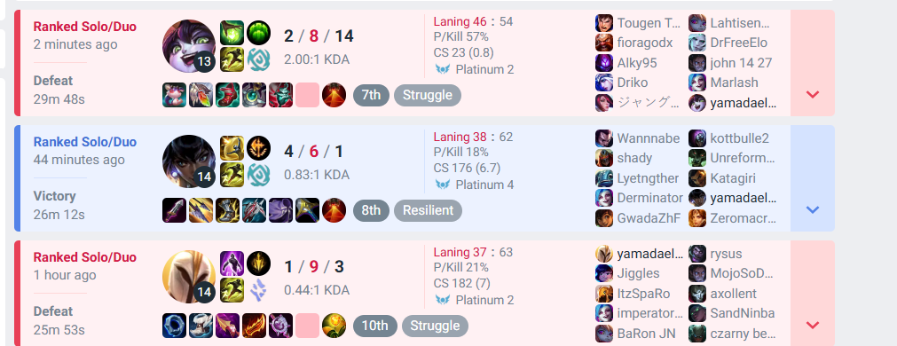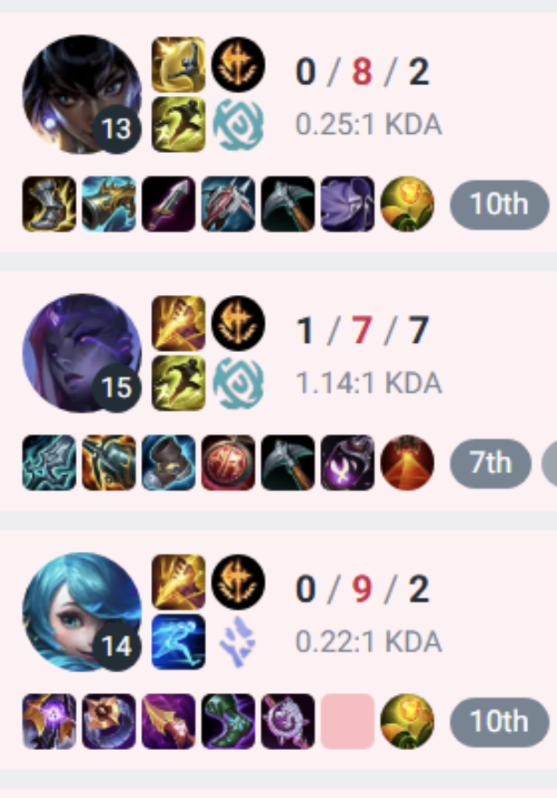 хз че тут сказать, просто весь день не идут игры даже на леснике. ну, я не виню тиму, я реально хуево играю прост и не знаю почему. ничего не получается. как же я хочу просто стабильно хотя бы 8/5/5 кда иметь или подобное а не так что просто весь день отсосов по 0 9. реально грустно как-то что одним дано все а я рожден неспособным играть в лигу