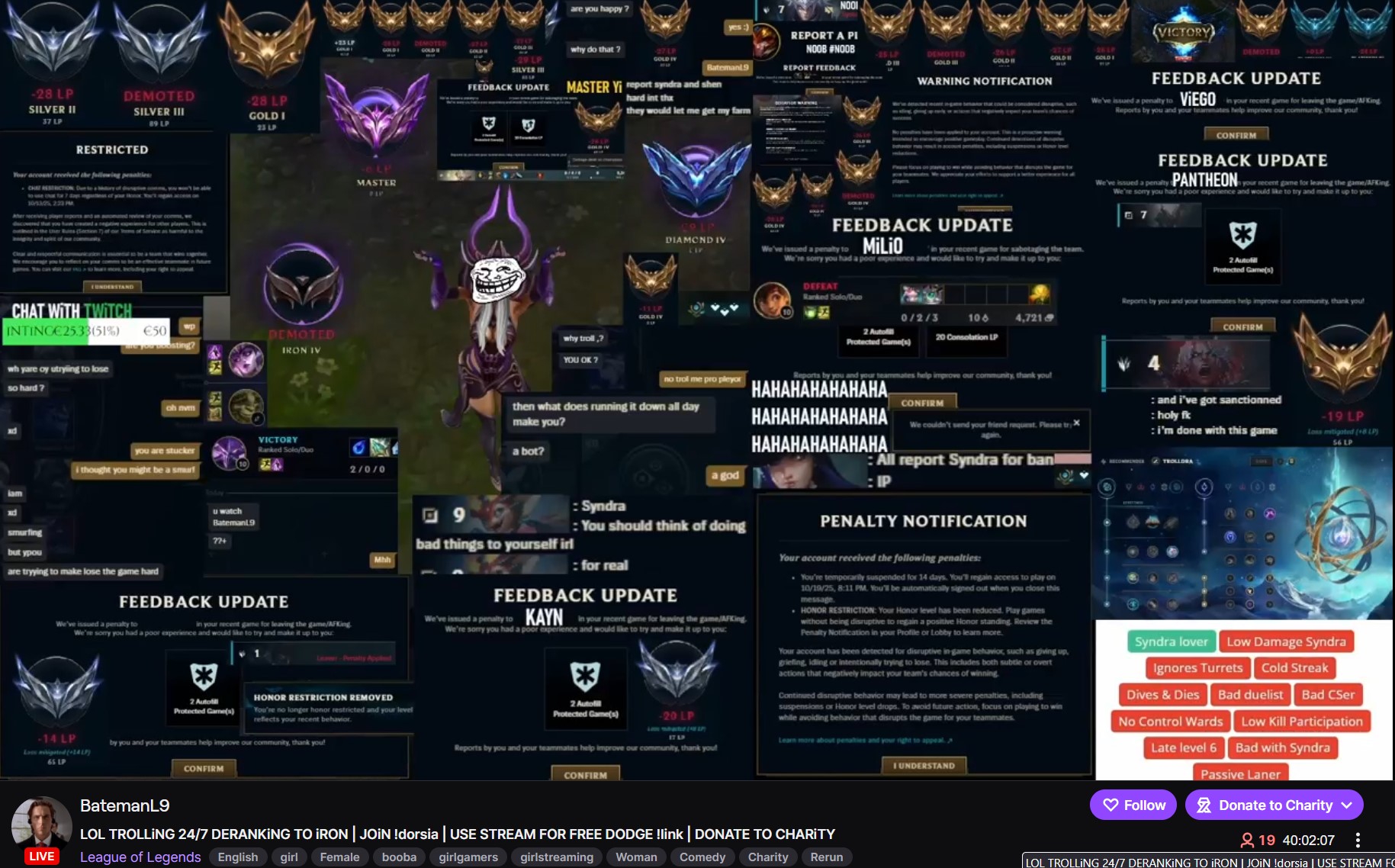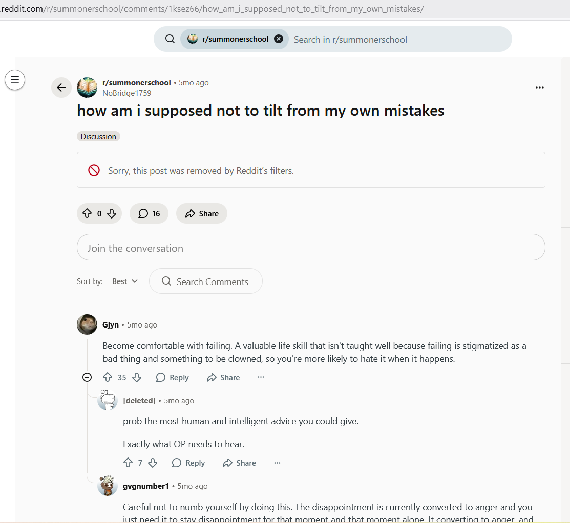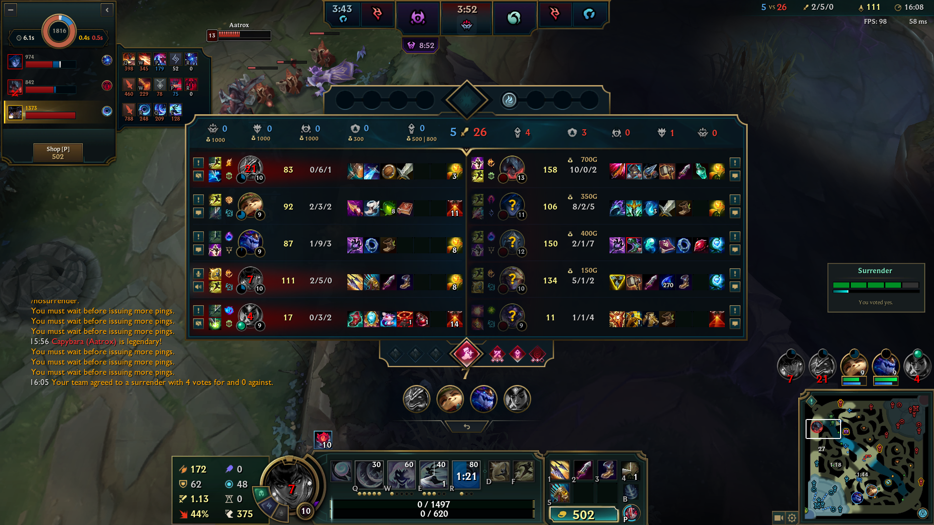 Бляя, некст 2 катки, наконец-то позволили затестить чемпа. В первой катке гигасмурф на акали 17й лвл аккаунта, который собирает 5 слотов к 35 и бегает с фулл настаканным меджаем. У моих включен фулл-нева-сурренда мод, закрыт в клетке на 43 минуты. Некст катка мы побеждаем, только появилась возможность забилдиться и потестить дамаг и разные ситуации - хуй там, враги моментально суррят на 20-й. Так мерзко от такого.