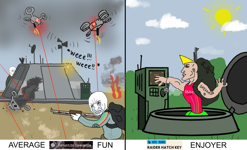 >>50395333 Я победил еще когда в рейд зашел потому что лутать мой труп в начале рейда нет смысла, а выхожу из рейда я в последние минуты через рандомный люк, к тому времени людей которые ради пывыпы заходят постреляться как правило нет.