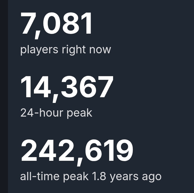 >>50383753 >130к это примерно больше чем дохуя для онлайн видеоигры Это не дохуя. Напомню что это почти пик, больше в ней не прибавится. Ну допустим выйдет даже на 200к к прайму сегодняшнему. Это уровень сезонной нишевой дрочильни типа пое1. Дальше онлайн будет только падать с каждым днем.