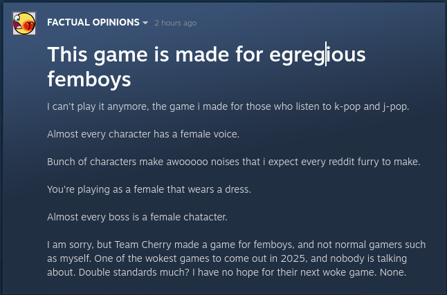 >>50473567 >>50473930 Какие же тупые люди играют в посредственную игру. Буквально не понимают ничего в играх, хвалят лвл-дизайн и солс-механики, хотя лвл-дизайн в игре уебищный, а солс-механики это вообще рак всех метройдваний. Смотрю на этих дебичей и смешно становится...