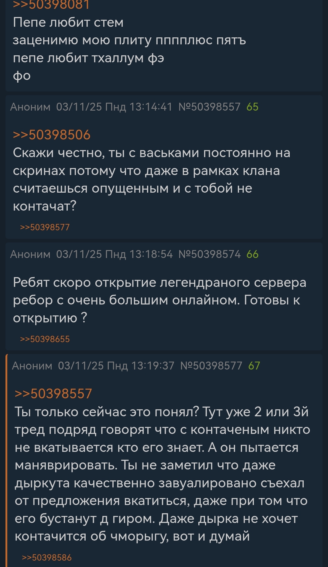 >>50401870 Ну не пиши ты блять хуйню, ну уже же сабжнули, что это не анон клан, а просто сходняк пидорков по интересам. Нет анон движ, нет совместного кача. Вы просто клан с чатиком, иногда с хелпой друг другу, как и любой васянский клан. Не нужно вводить анонов в заблуждение, чтобы после того как они придут на сруч, увидели все это и опять в треде буду поливать вас дерьмом, вам видимо это нравится мазахисты.. >>50401098 >>50401047