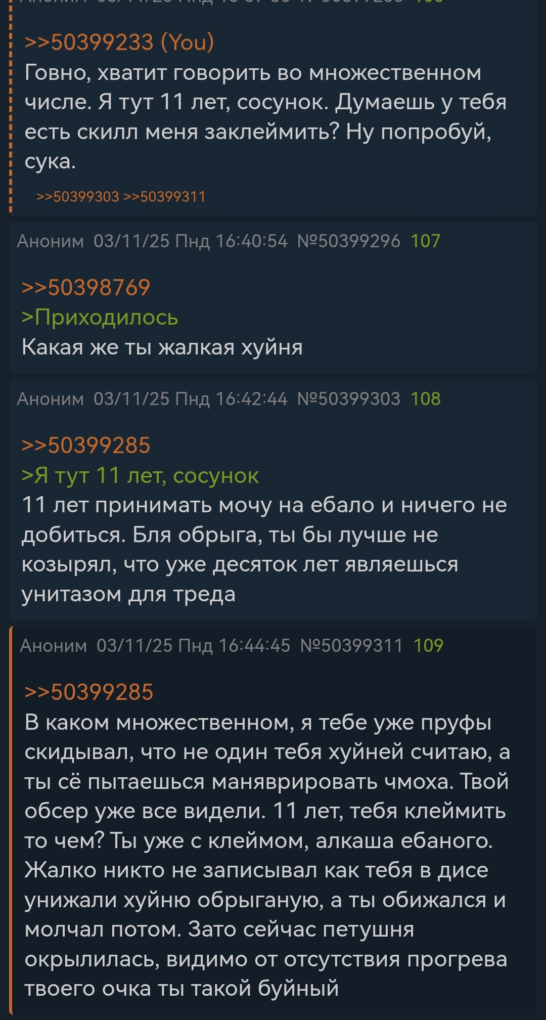 >>50399285 >Я тут 11 лет, сосунок 11 лет принимать мочу на ебало и ничего не добиться. Бля обрыга, ты бы лучше не козырял, что уже десяток лет являешься унитазом для треда