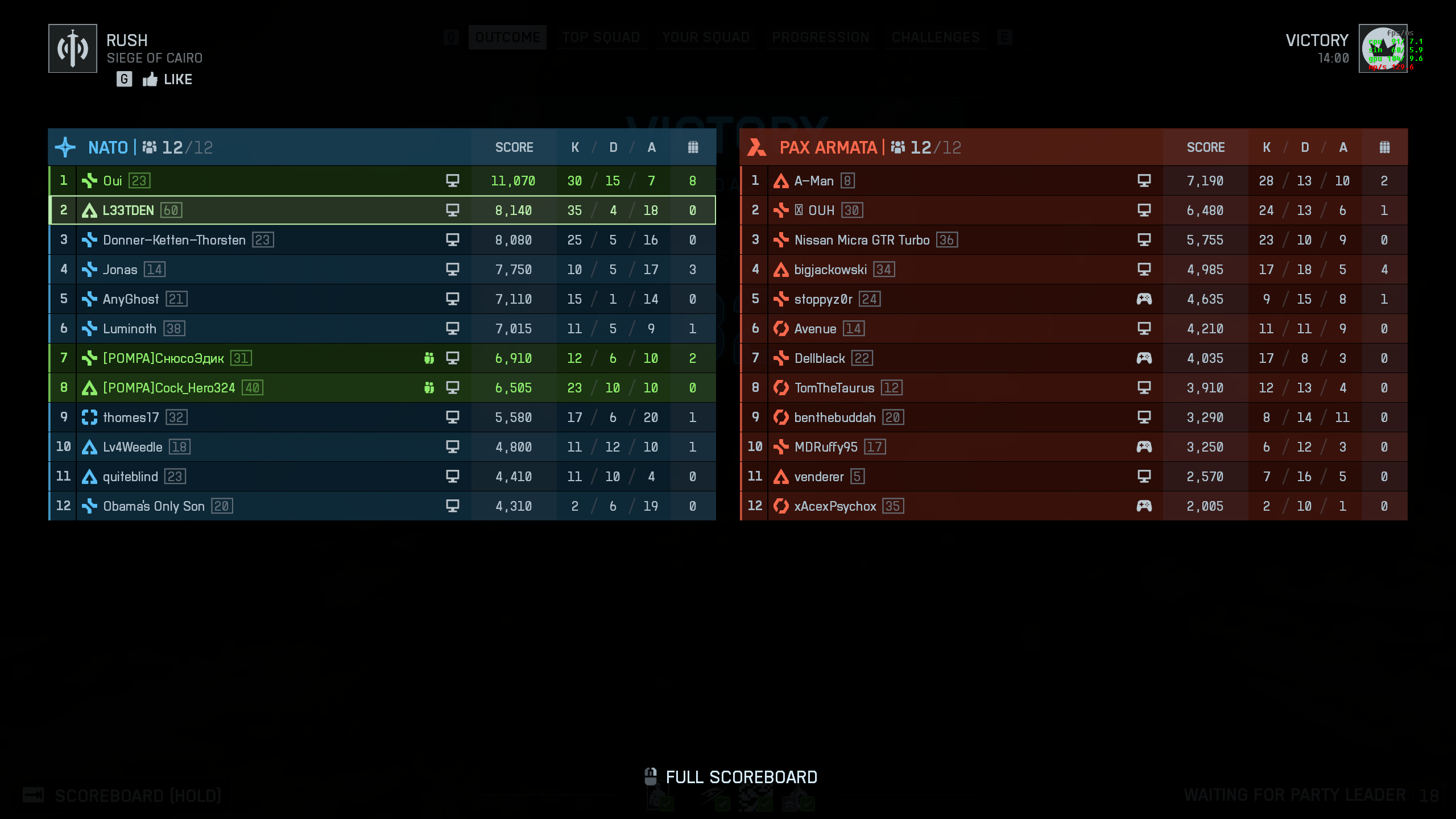 Не забываем забирать бесплатный еженедельный подарок! >>50404759 Ну он так то прав, многие команды побеждают до тех пор пока надо двигаться по карте. Как начинается замес на малых количествах точек - они начинают сосать хуй, потому что банально не умеют стрелять. И дальше просто методично режут команду врага и заканчивают 2-3 уже в свою пользу. Буквально вот прям щас сыграл. Команда моя вообще хуево двигается по карте но враги прямо хлебушки, при условии что меня подняли 0(!!!) раз за матч, потому что медиков походу у нас вообще не было, с чего я тоже охуел, я из каждой перестрелки выходил 1-1/2 победителем и методично вот нарезал ребятушек. Когда осталось 5 точек на карте и они вели 2-0, всё, они поплыли, перестрелять наших ребят не могут, удержать свои малые точки тоже не могут.