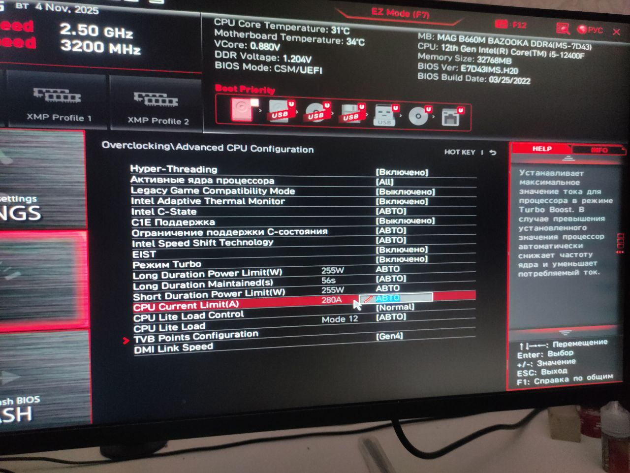 >>50401497 Короч, разобрался я (вроде бы. Но хоть обучение прошёл, теперь при запуске игры в меню буду попадать). У меня в биосе стоял вот такой лимит. Я выставлял на стандартный в 65 ватт, но всё равно не помогало. А вот выставить стандартный, потом F10 и перезайти, а потом ещё и вручную прописать эти лимиты в 65/117 ватт, 28 секунд, и, самое главное. Там стоял лимит 151А, я выставил 100А. Проц вроде от этого теряет производительности на несколько процентов, но с другой стороны и греется меньше. Как же я счастлив Вот на второй пикче видите, лимиты как бы стоят (скрин старый, у меня стояли 65/117), но как бы АВТО. Мне помогло продублировать значения вручную, сделал как на третьем скрине, и всё заработало