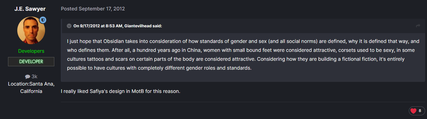 >>50402918 Феминизм, в основном. Натужное распределение сильных баб по всей игре, от баб солдат, до главной святоши сюжета, которая стойко пропускала хуемразь, даже когда её пытали Пантеон богов заботливо поделен поровну между полами. При том, что боги войны, смерти и справедливости это женщины В описании полов при создании персонажа заботливо указывается, что существуют матриархальные культуры, а в прочих у женщин и мужчин разнообразные роли. Якобы патриархат только в империи и дирвуде, но и там от не отражен по факту никак, и бабы повсюду, от пьяного быдла, лезущего в драку, до солдат и наемников. Т.е. чисто мужских профессий и занятий в мире игры не существует