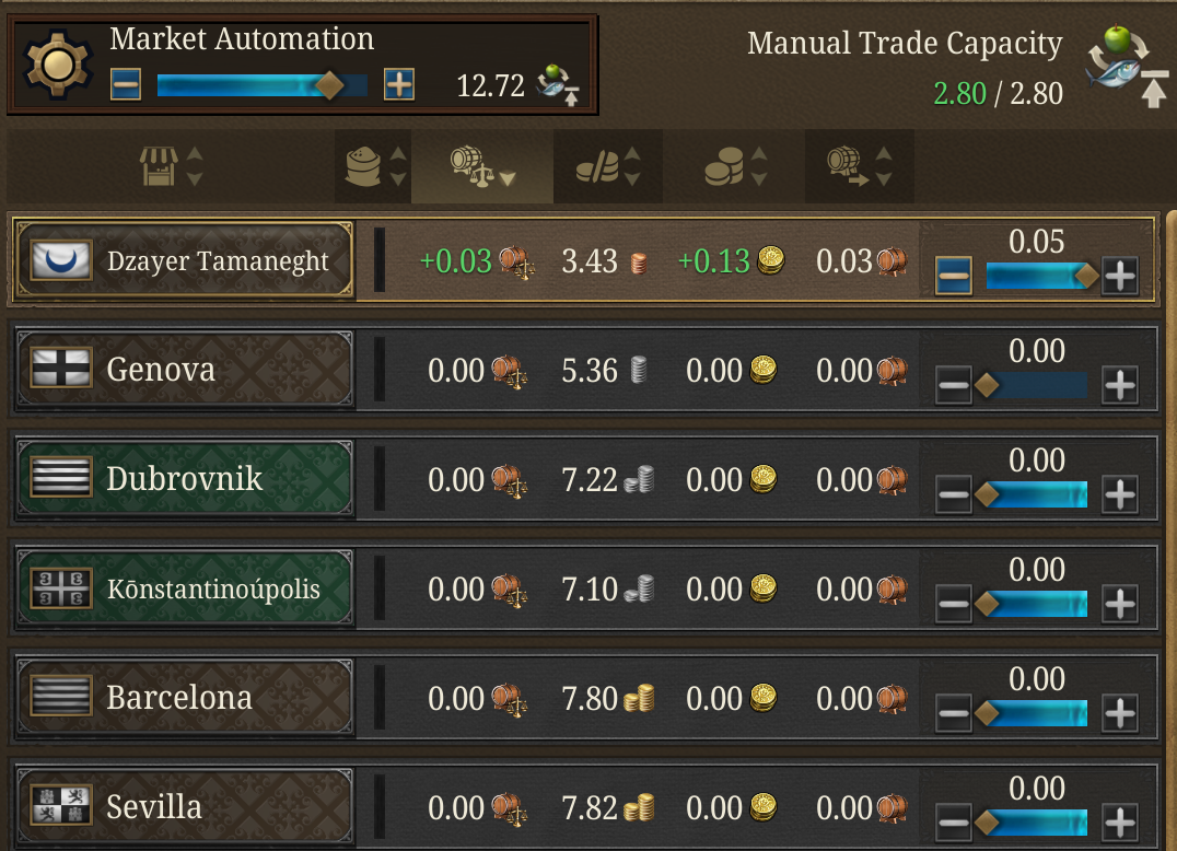 Например, ты создаешь торговый рут используя 1 капасити, он падает тебе в текущие торговые пути. Тут ты такой хук и высвобождаешь из автоматизаций капасити чтобы пустить больше свободную на этот новый путь чтобы купить большее количество товаров. Ты жмешь увеличть капасити, а он нихуя не показывает сколько на самом деле будет в следующем месяце, цифра капасити увеличивается, а количество реального поставляемого товара - нет, ее можно посчитать самого только наведя на нест инфу, где уже увидишь импортируемую с рынка, где в новой нест инфы ты уже увидишь сколько стоит единица помноженная на дальность, лол.