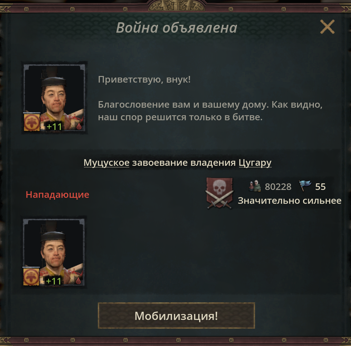 >>50418130 А ты в каком году играешь? Просто я самый ранний взял. У них там не сёгунат, а рицуё. Они друг с другом воюют какими-то недоармиями по 20 человек. На меня ни разу не выебывались.