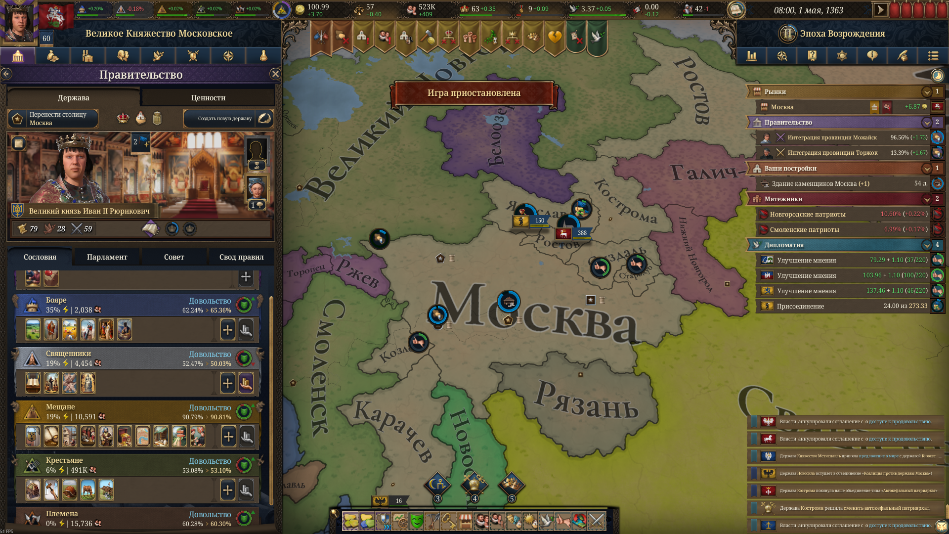 Играю за Москву и меня так заебали эти вассалы. Их сейчас 20+ штук, выделял почти каждую провку потому что по другому тупо нельзя, так с каждым из них надо 150 месяцев улучшать отношения а потом и присоединять, примерно 3 года если маленький, Смоленск вообще пишет что будет 80 лет присоединяться, а у меня ещё Пермь которая размером как я. Не знаю я что делать дальше, лимит на вассалов уже достигнут, дипломаты трещат по швам, приходится сидеть десятилетиями, интегрировать когда ирл в это время уже Русское царство до Кавказа дошло. Жду модов для фикса этой хуйни.