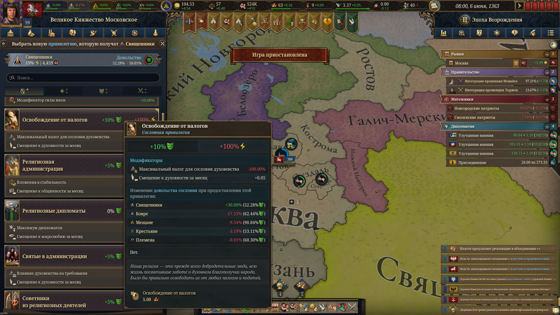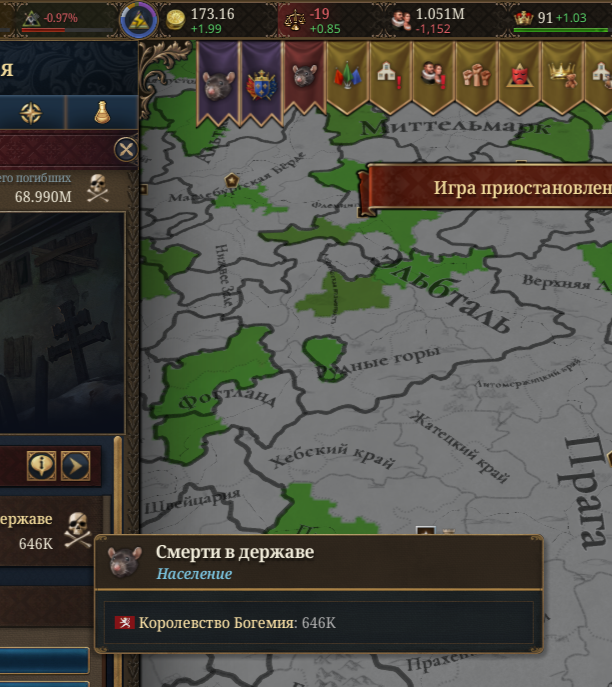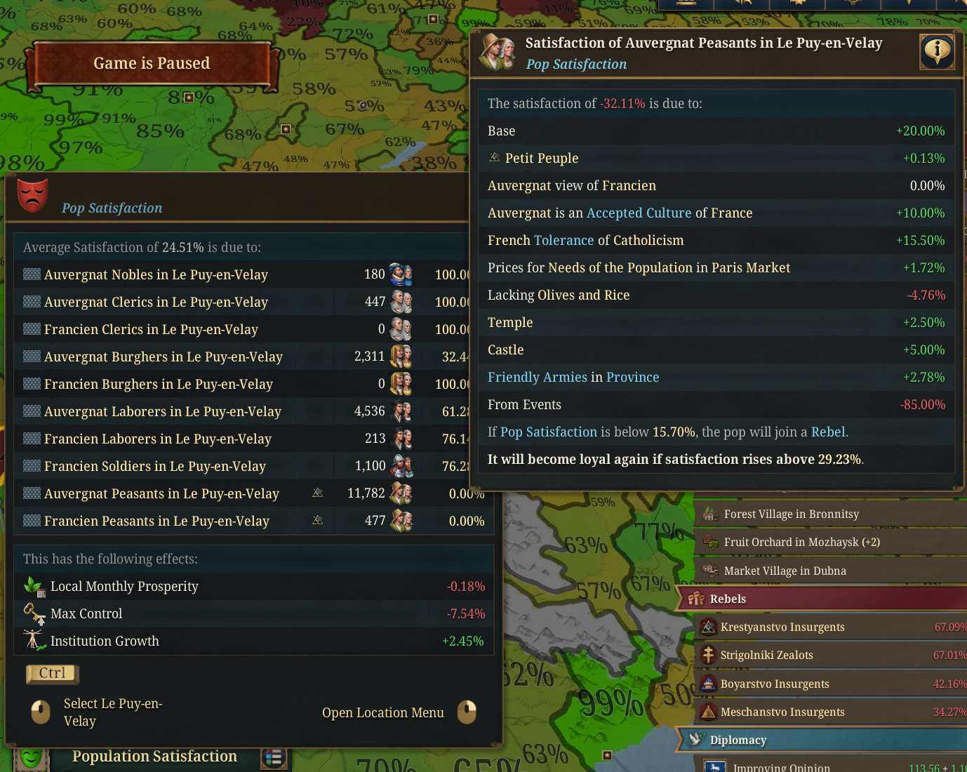 При этом не я один страдаю от этой срани, у ИИ тоже есть провинции в вечном бунте из-за модификатора какого-то эвента. И вешается он только на крестьян почему-то.