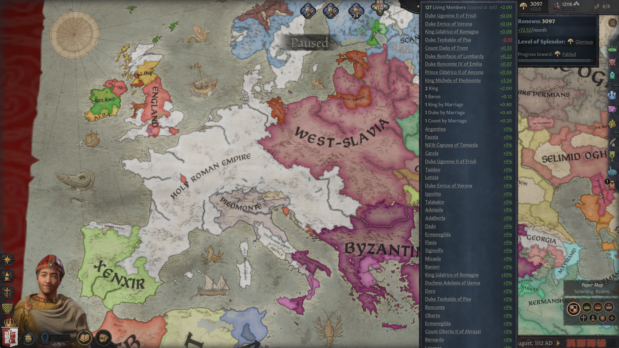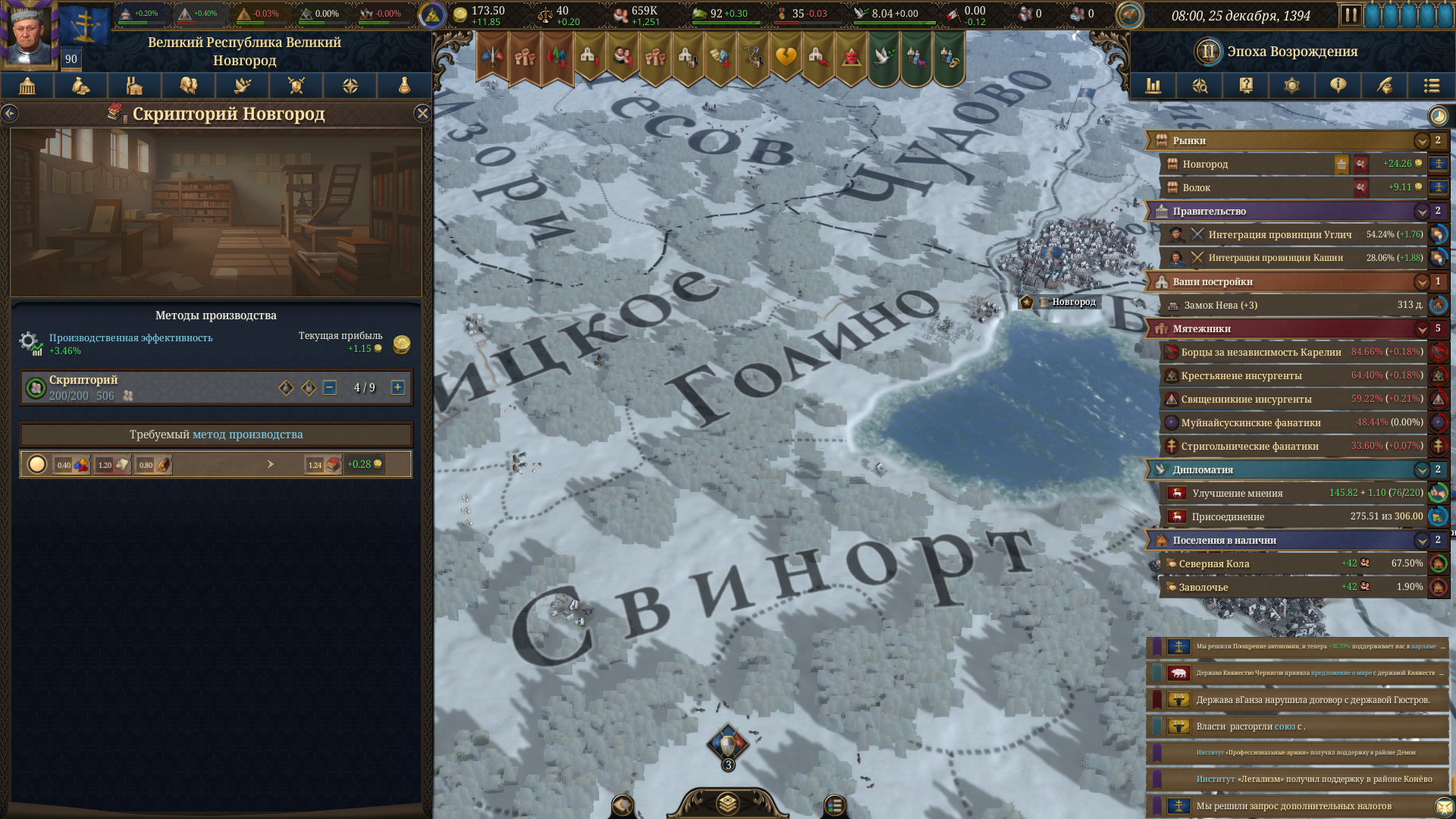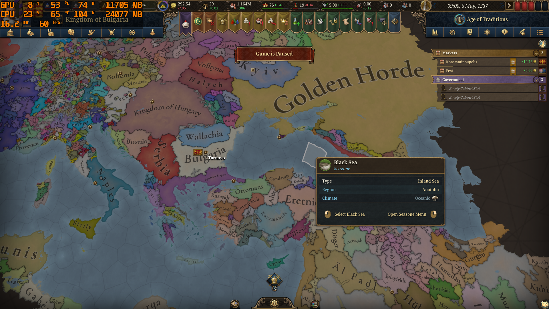 Затестил европку вчера - ну на моем нупуке с 5050m и 13420h, 16 рам одной планкой, дни мотаются заебок, а вот при приближении фпс нихуево так проседает, ну и при смене месяца тоже какой-то микрофриз, но в целом похуй, это я в настройки пока вообще не заходил. Начал за Сербию и это вроде как имба - серебро, золото, сразу дают баффы и клаймы на 4 византийские провки (по факту надо 5 жрать, иначе анклав), ну я напал, когда у них война с болгарами началась, после присоединения становишься кокперией с автокефалией (хотя их вроде всем рандомно дают из-за бага, лол), но корок на эти греческие пробки не дают, так что хз - интегрировать их 100 лет, либо вассала выделять. Интерфейс громоздкий, но не прям ужасный, хотя я так и не смог найти вкладку, где можно посмотреть централизацию-децентрализацию и все это говно, хотя вроде уж все перетыкал.