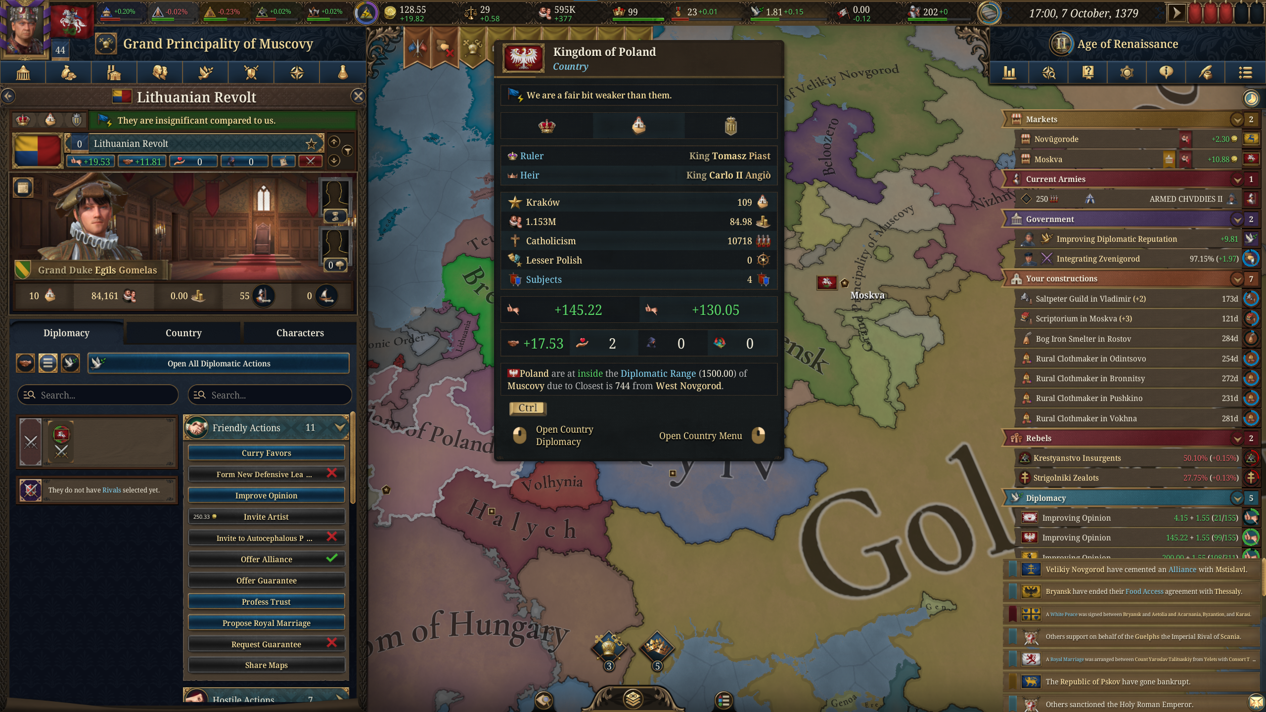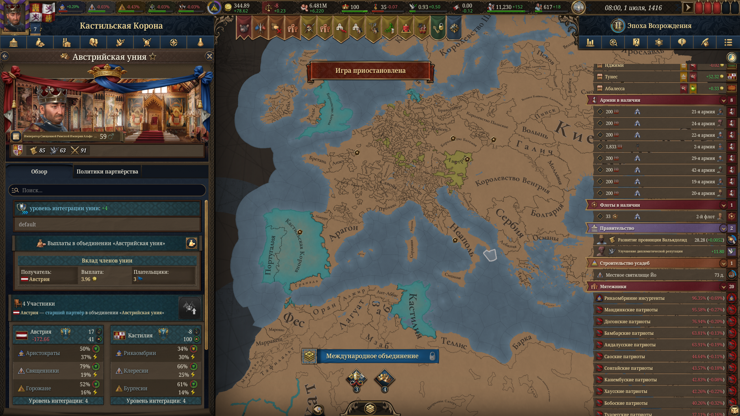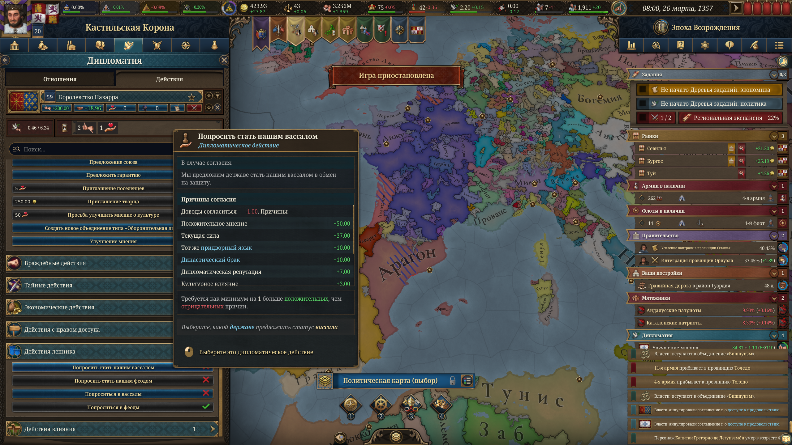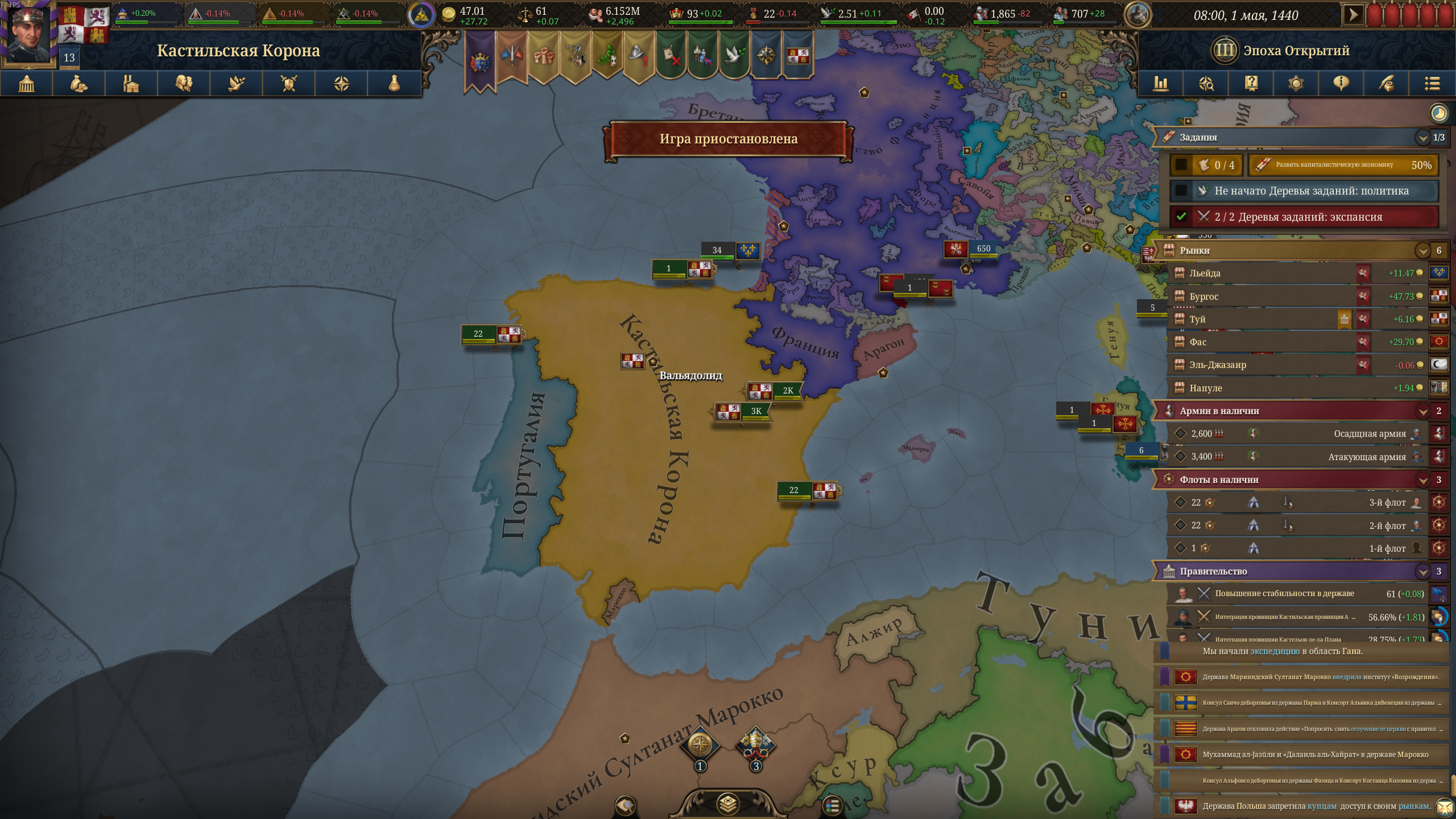 Во второй партии чуть получше дела. Португалия в унии, Гранада присоединяется, Валенсия и Арагон вассалы. Дальше расширяться либо на Францию (да на нахуй), либо в Марокко (но мне этот вариант тоже не особо нравится).