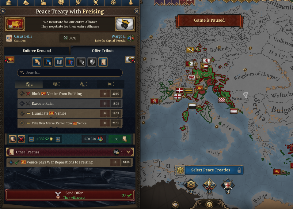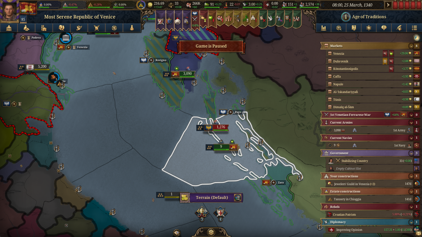 Ебать за Венецию весело. Болезни и наводнения ебут конечно, но войны прикольные. Во время войны против Вероны пока моя коалиция ебала Верону, их армия в 15к тупо стояла у меня в провке рядом с венецией ине двигалась. В итоге войну они проебали, но я ничего не смог отгрызть. Щас сам влетел в Феррару, а за них впряглась Аквилея, армию аквилеи я тупо утопил вместе с флотом, а 1к феррары оказались запертыми на каком-то копроострове в Хорватии. Щас обоих аннексирую и посмотрю какая коала соберётся.