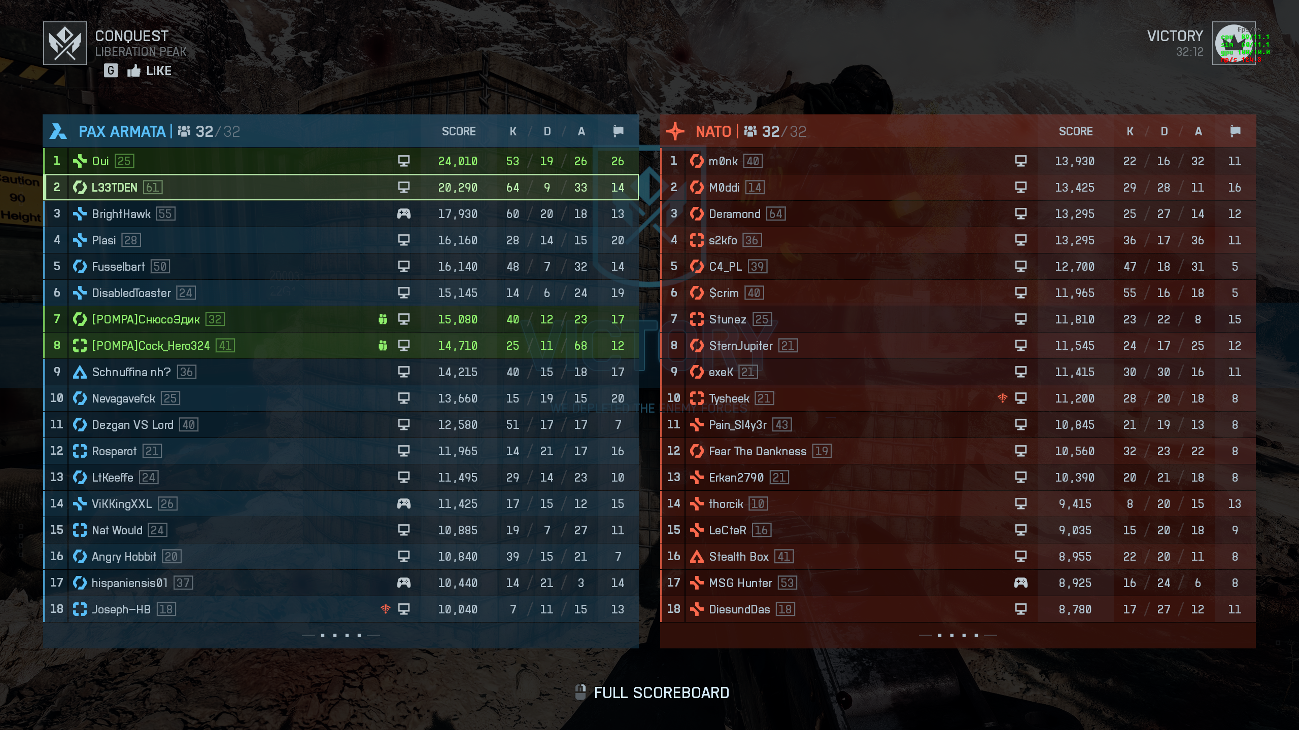 >>50414122 (OP) Пиздец, анончики. Обновил комп и нихуя не помогло. Сидел на RTX3060ti FullHD high settings i5-10500. Фпс было от 60 до 100 в разных ситуациях Поставил I7-10700k фпс стало 80-120 В целом нихуя не изменилось, фпс как падал внезапно в мультиплеере, так и падает. Вместо +50фпс получил лишь +50ватт тепловыденения, а батла как лагает так и лагает. Пиздец, самая бестолковая трата в моей жизни