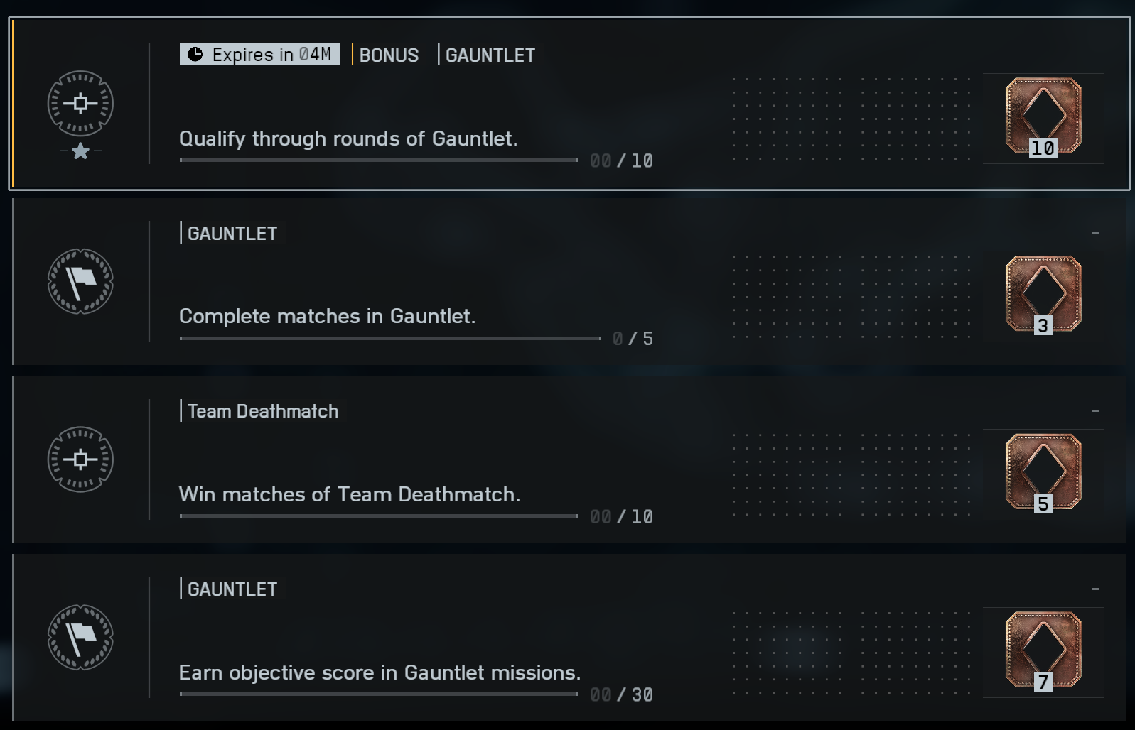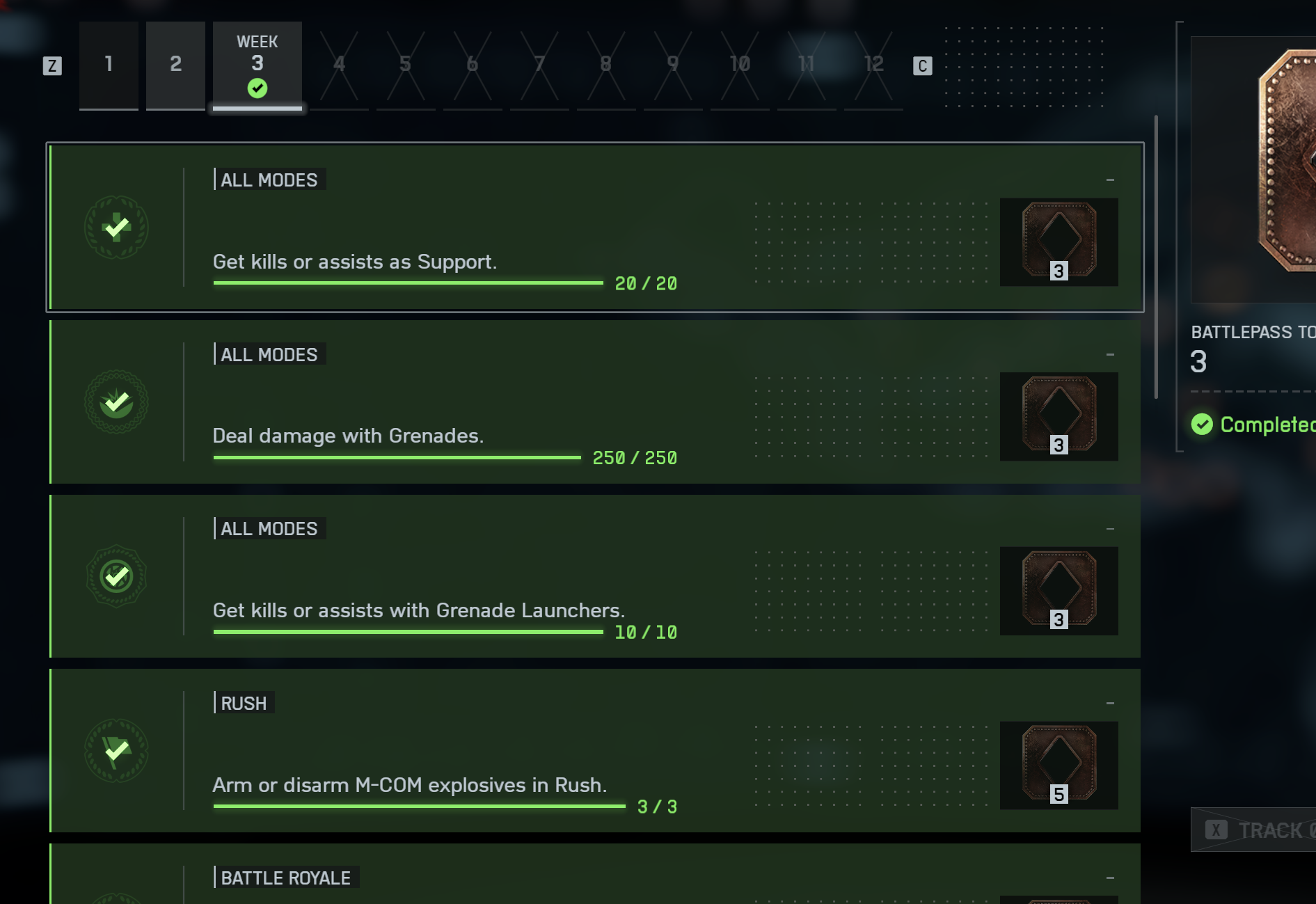 >>50430106 У всех по разному. У меня на прошлой неделе пизщец был по типу: 3 победы в гаунтлете, 10 выполненных контрмиссий (которые выпадают раз в 3 игры), 10 квалификаций в гаунтлете, 20 ассистов\ревивов, киллов в БР. Я конечно же ебанат, который играет во все режимы, но не настолько отбитый, чтобый целую неделю дрочить БР. (Хотя вчера 3\4 за вечер сделал, лол)