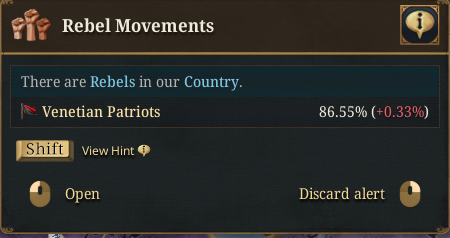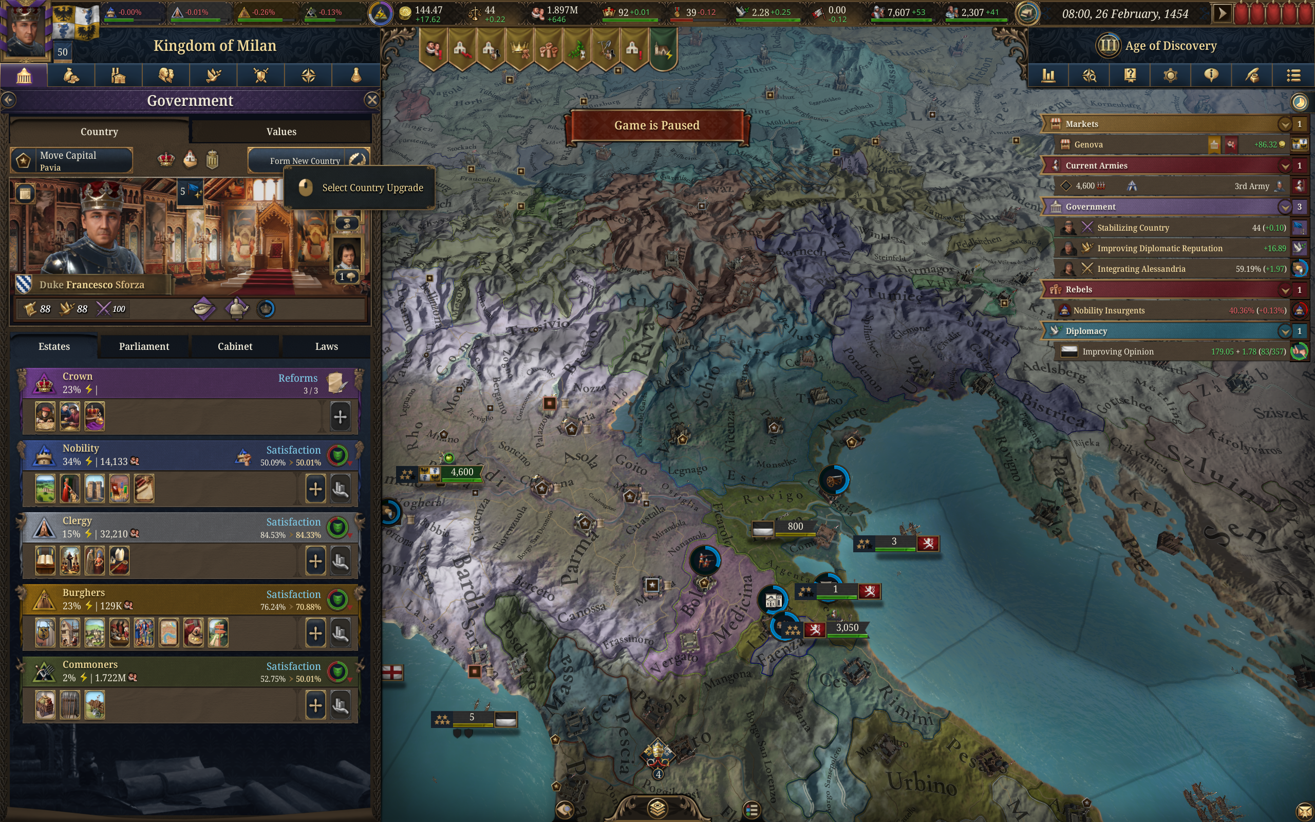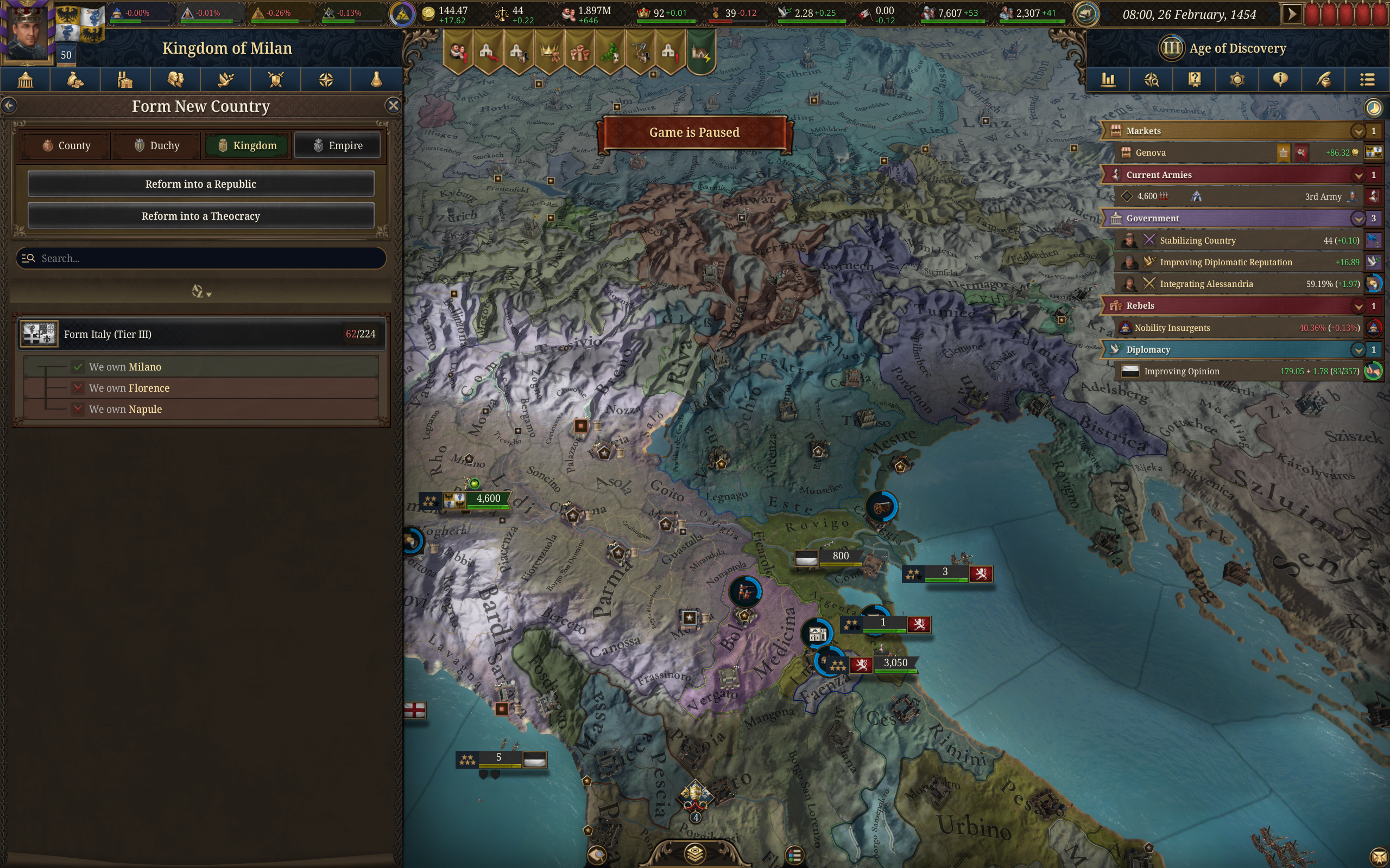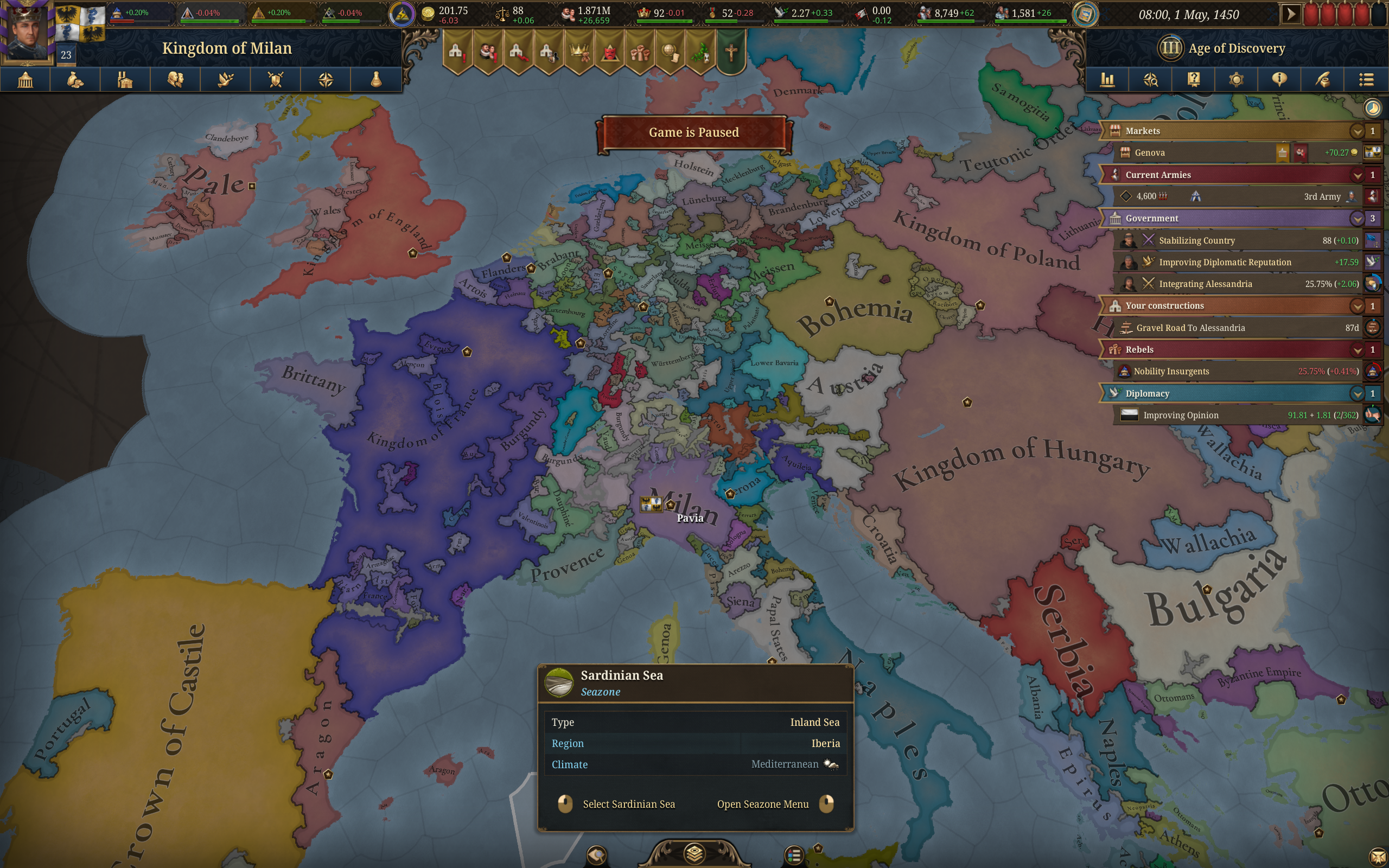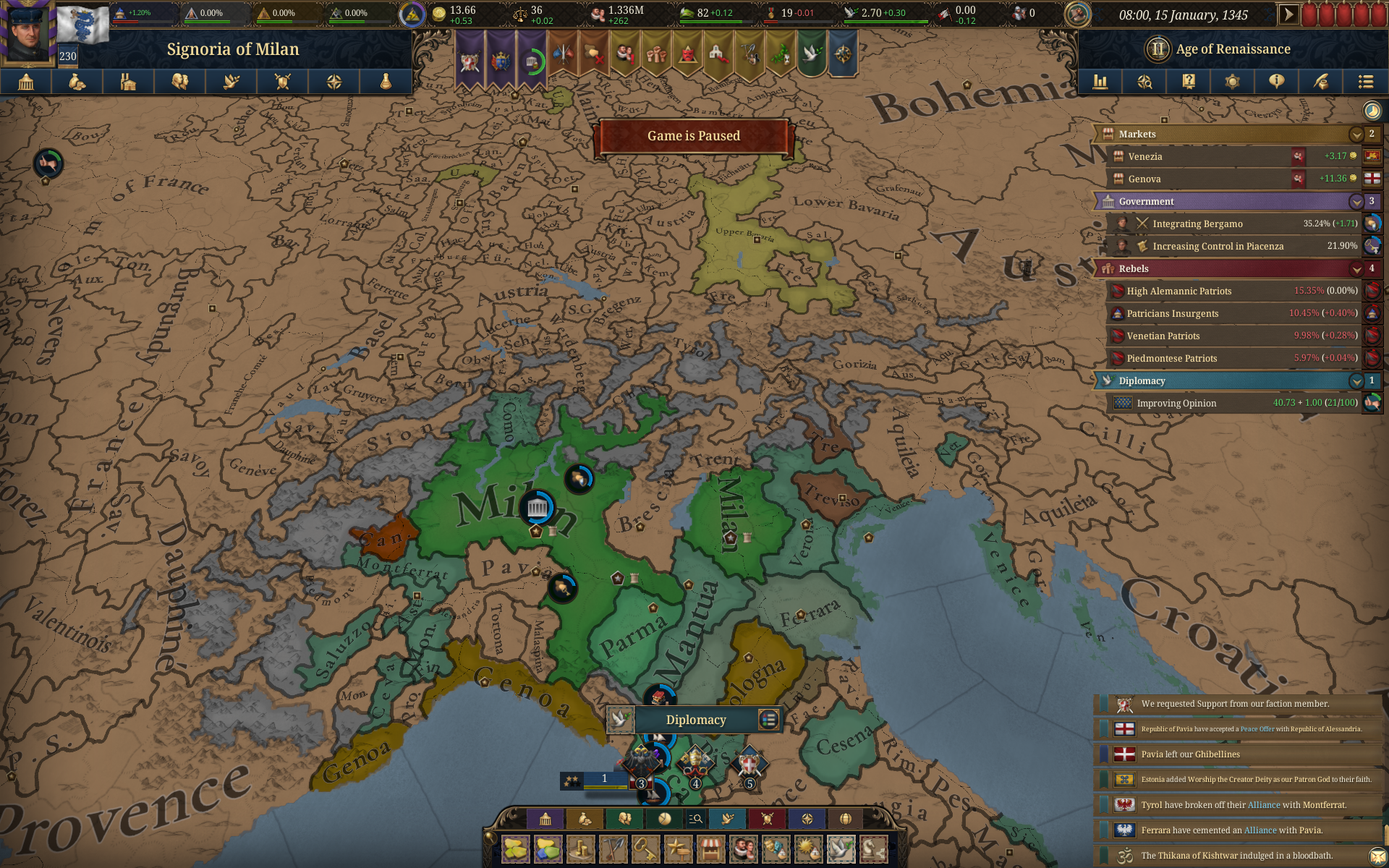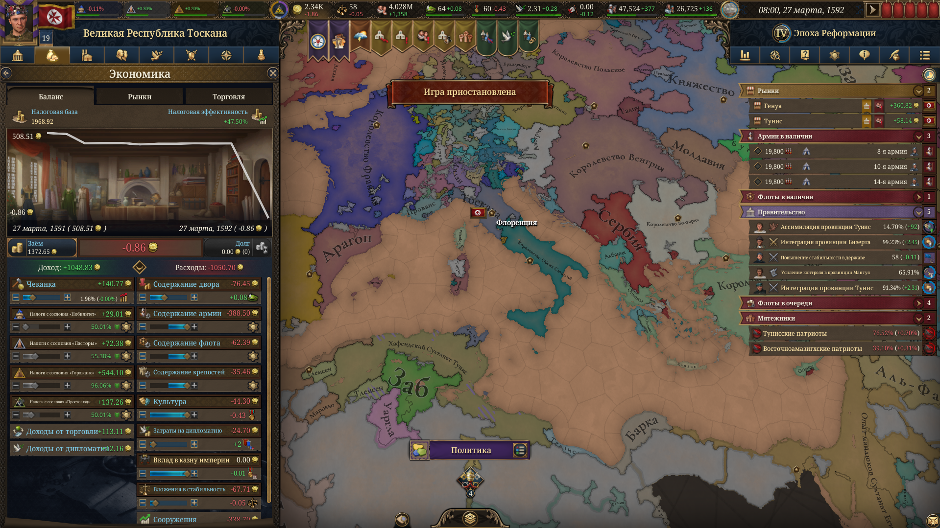 Планы на будущее, национализировать ебаннную Геную, потому что там повстанцы прям ебут, у них дебаф -50% Conqured, полагаю, за то, что я еще не национализировал их, приходится их давить советником чтобы они опять не брыкнули.