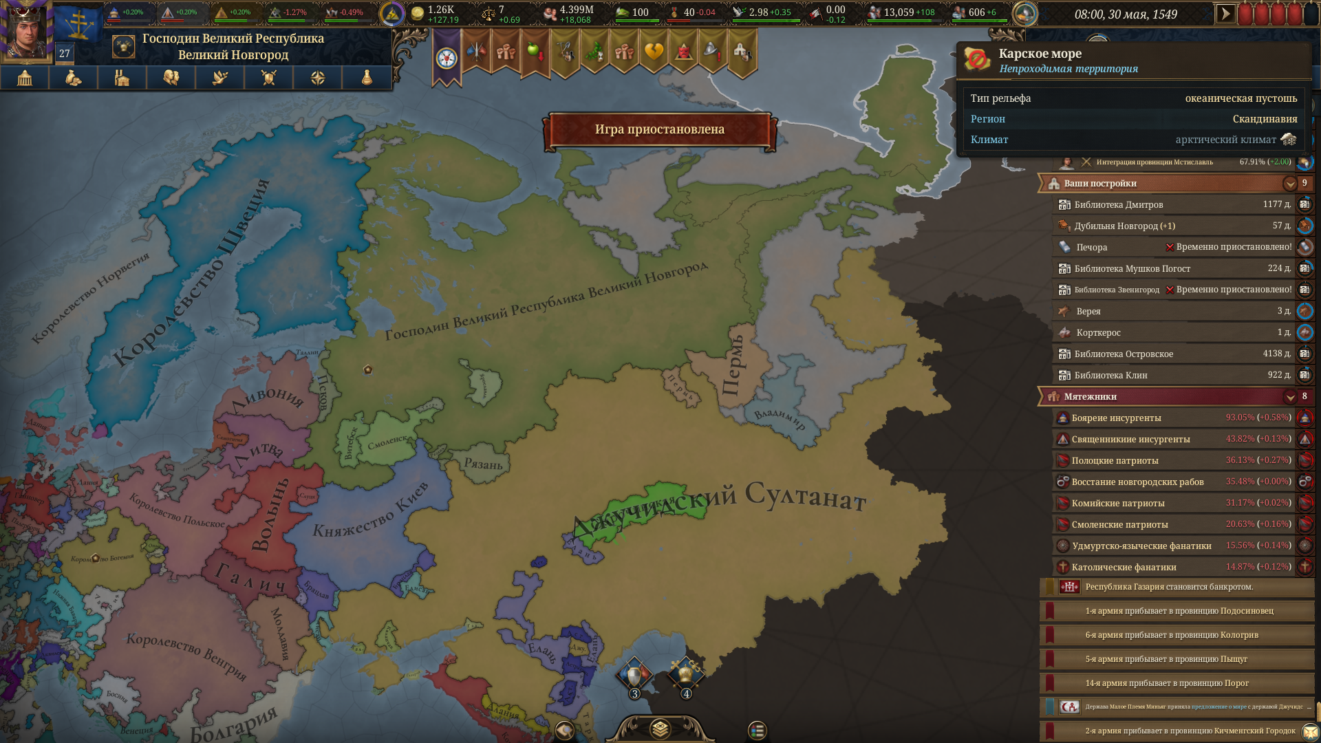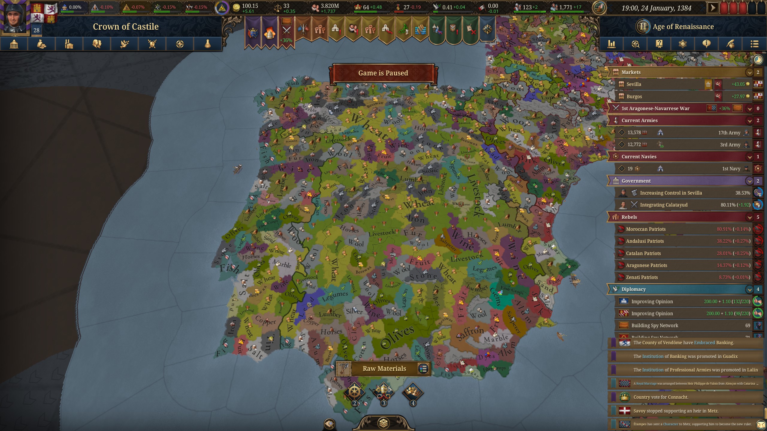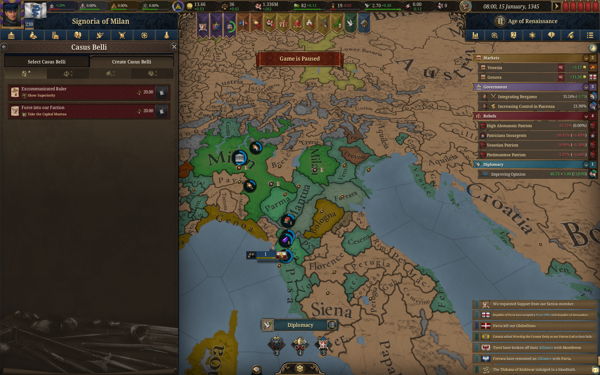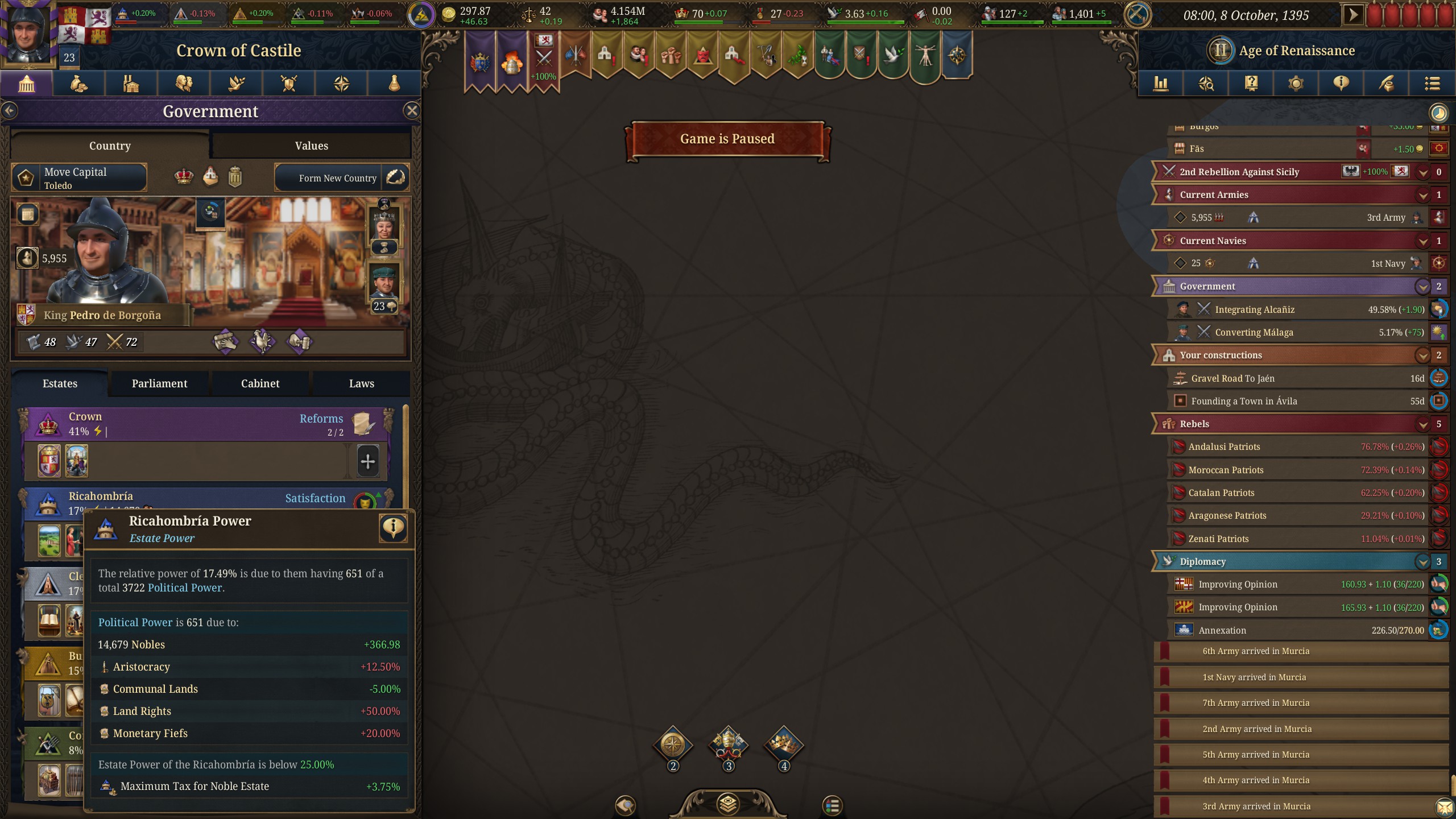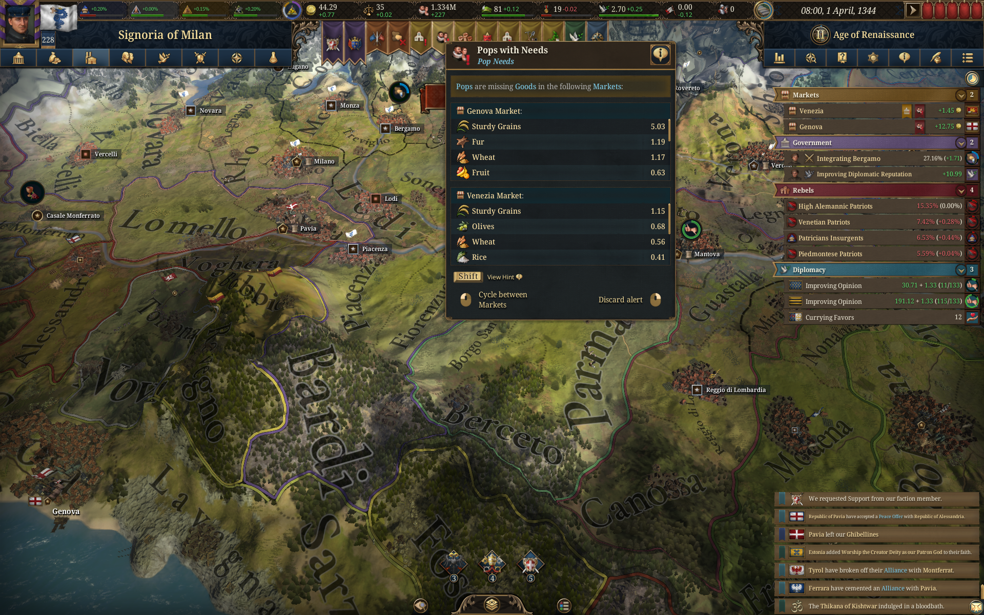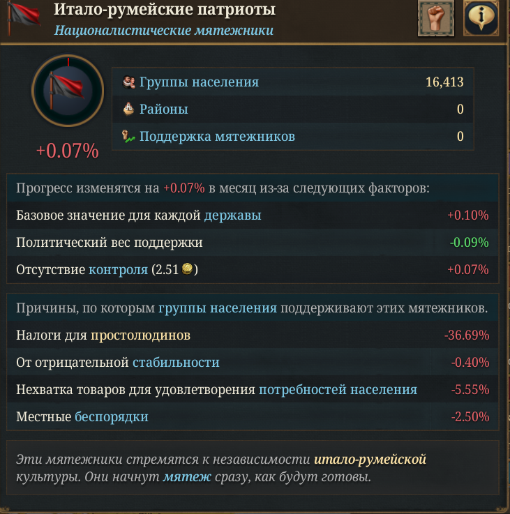 Планы на будущее, национализировать ебаннную Геную, потому что там повстанцы прям ебут, у них дебаф -50% Conqured, полагаю, за то, что я еще не национализировал их, приходится их давить советником чтобы они опять не брыкнули.