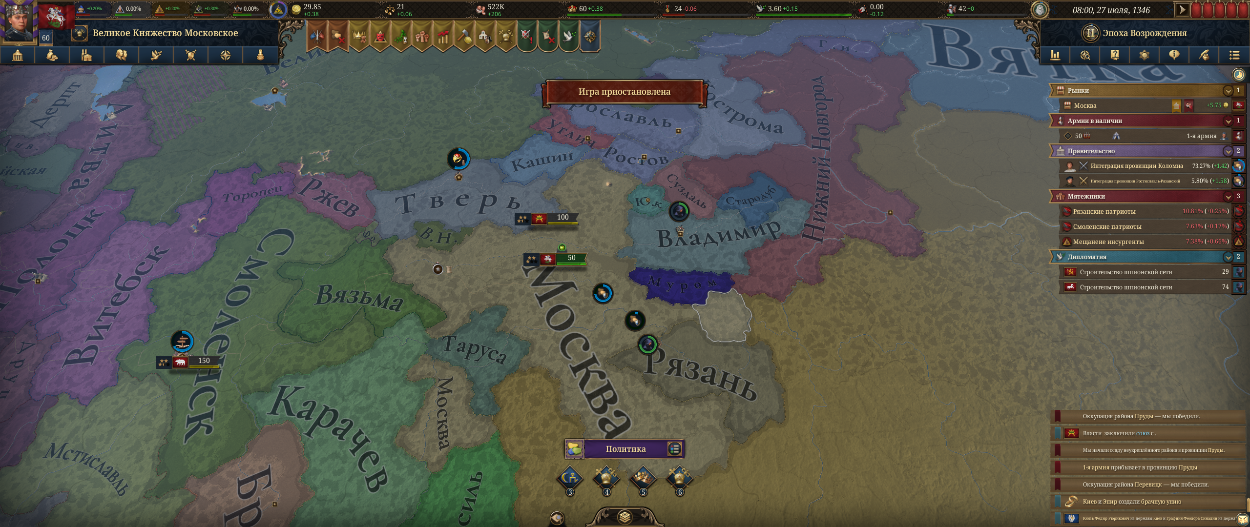 бля я нихуя не понимаю что в этой игре делать поставил торговлю и строительство на автомат захватил провинции в рязани, которые интегрировать лет 100