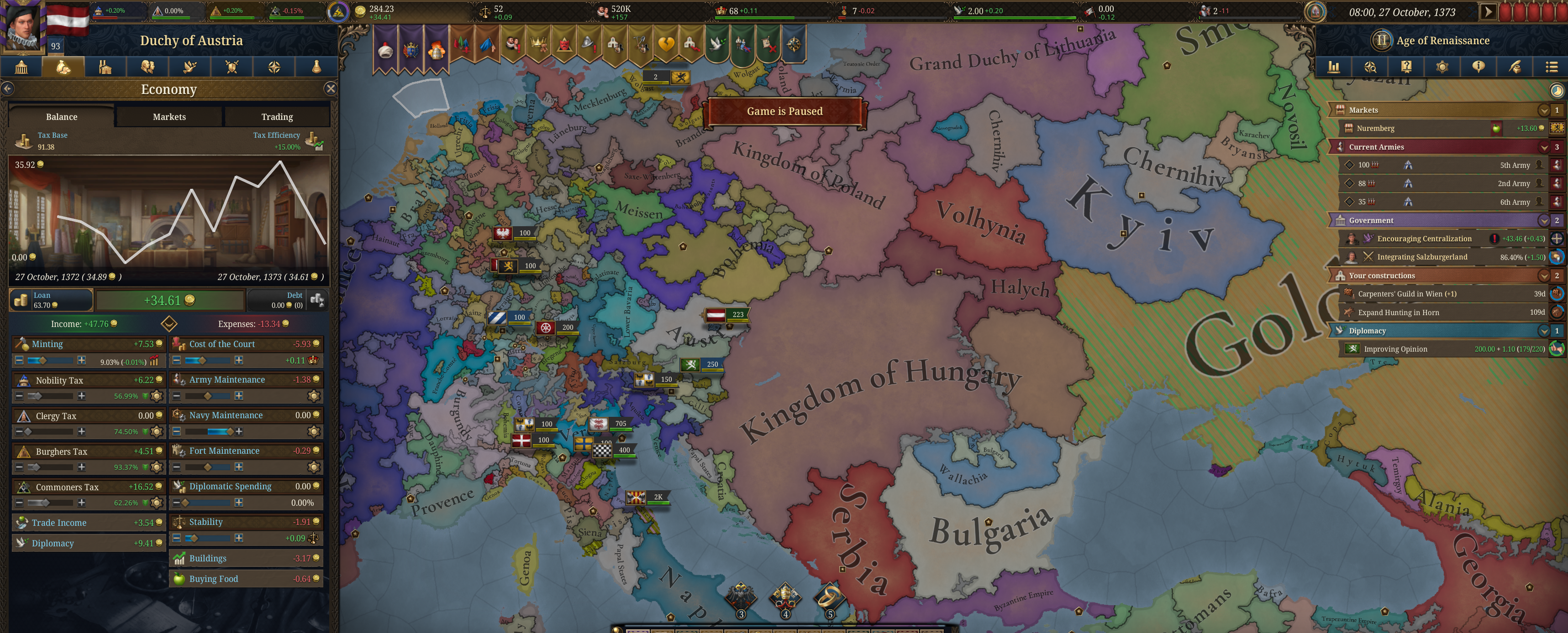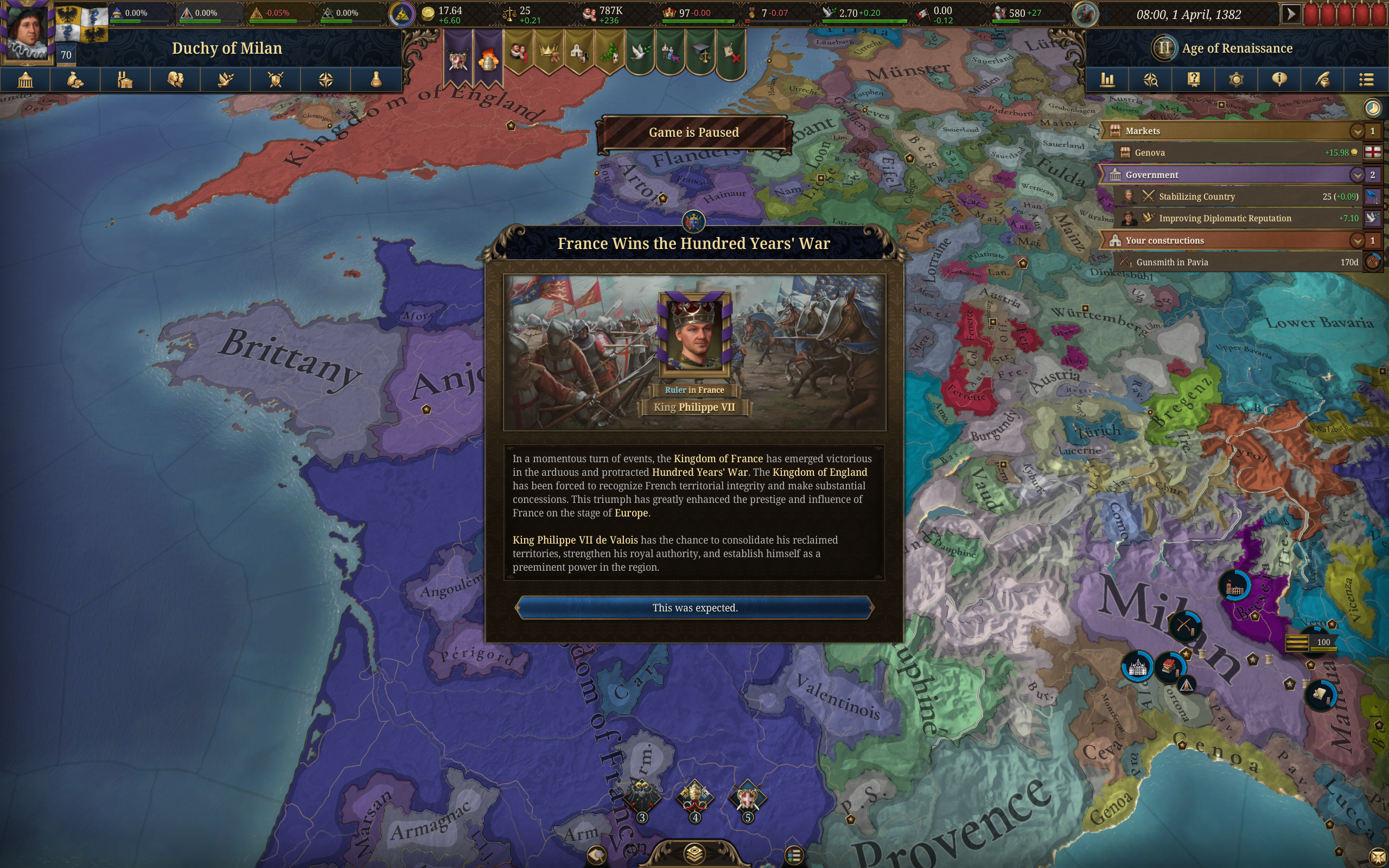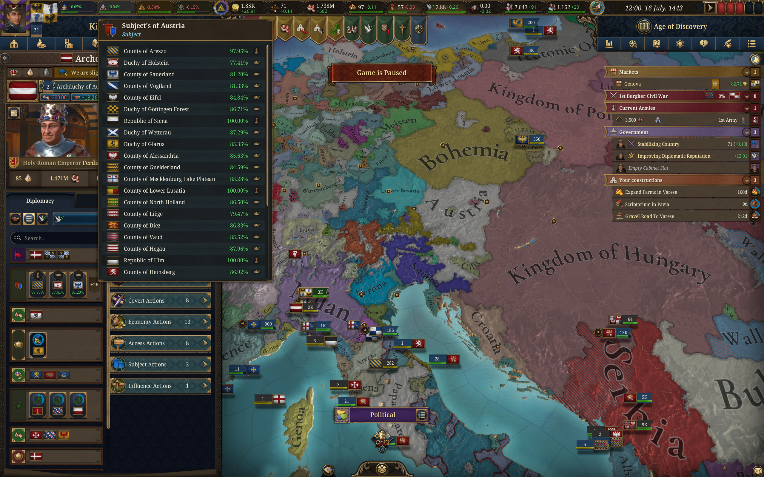 Вот такой подпивасный покрас на начало еу4. На самом деле дальше лезть уже нет смысла - контроль будет никакущий. Особенно с Генуей всё печально, но вся проблема в Алессандрии, точнее с Австрией, которая сделала эту хуйню своим вассалом, как и кучу других миноров. Благо на это он всрал всю свою ёмкость дипломатии, так что мой союз с Папой и Неаполем ожидает возможности влететь в этого пидараса на габсбурге. Из помойки под названием сри вылетел ещё в 14 веке после срача гвельфов и гибеллинов, фраха закончила столетнюю войну лет за пятьдесят и сейчас гегемон всего и вся. Если у фрахи будет казус ьелли по ивенту для влёта в меня, то мне страшно.