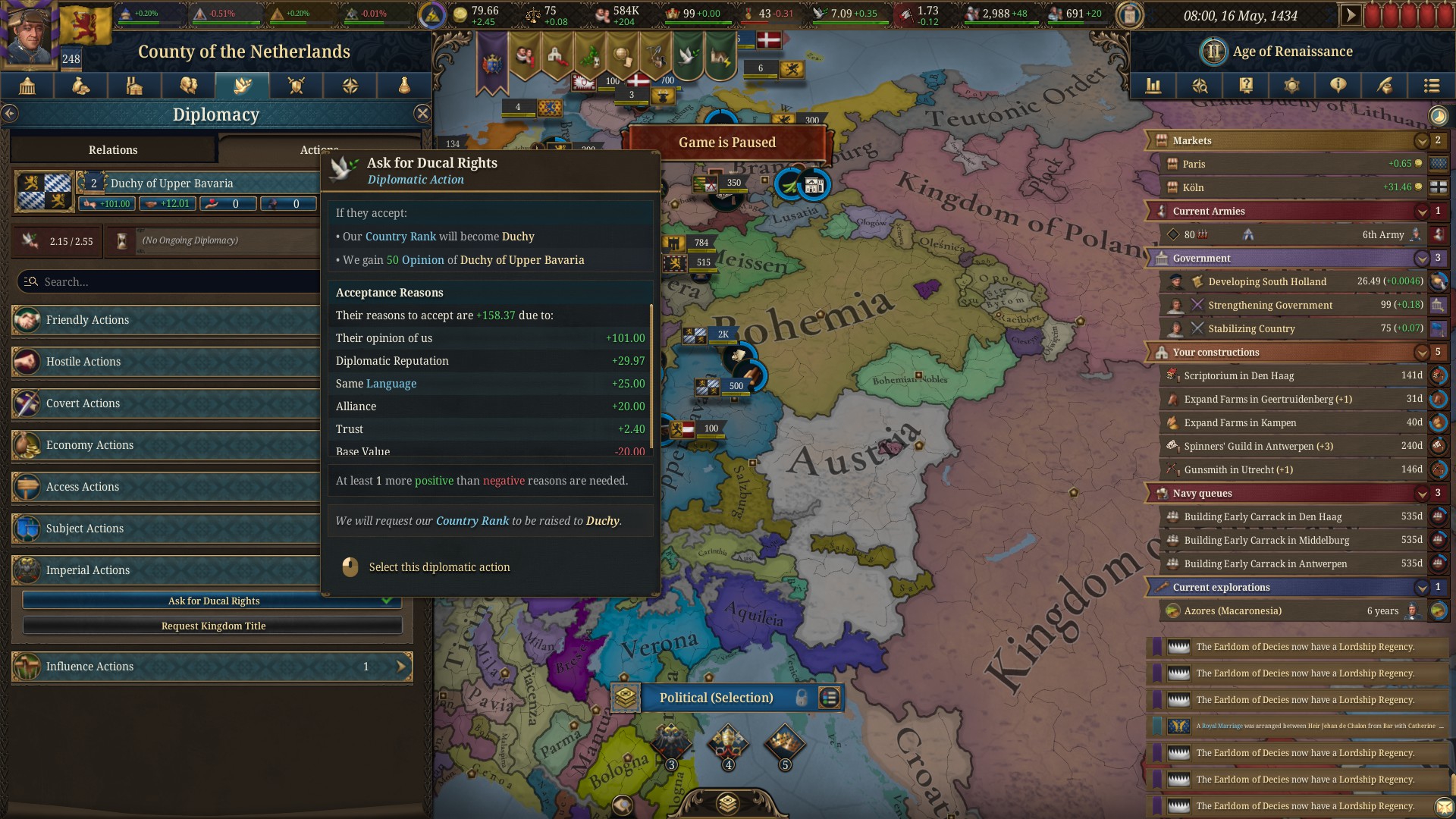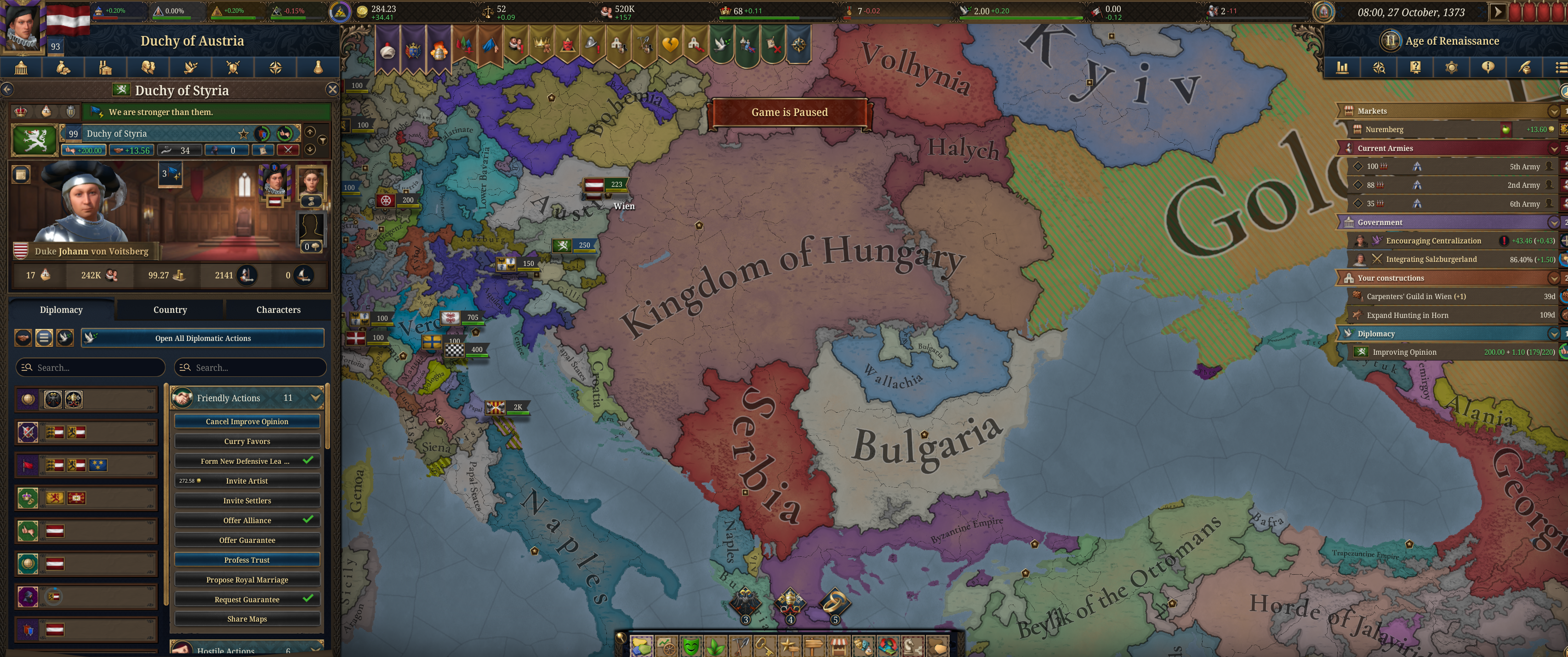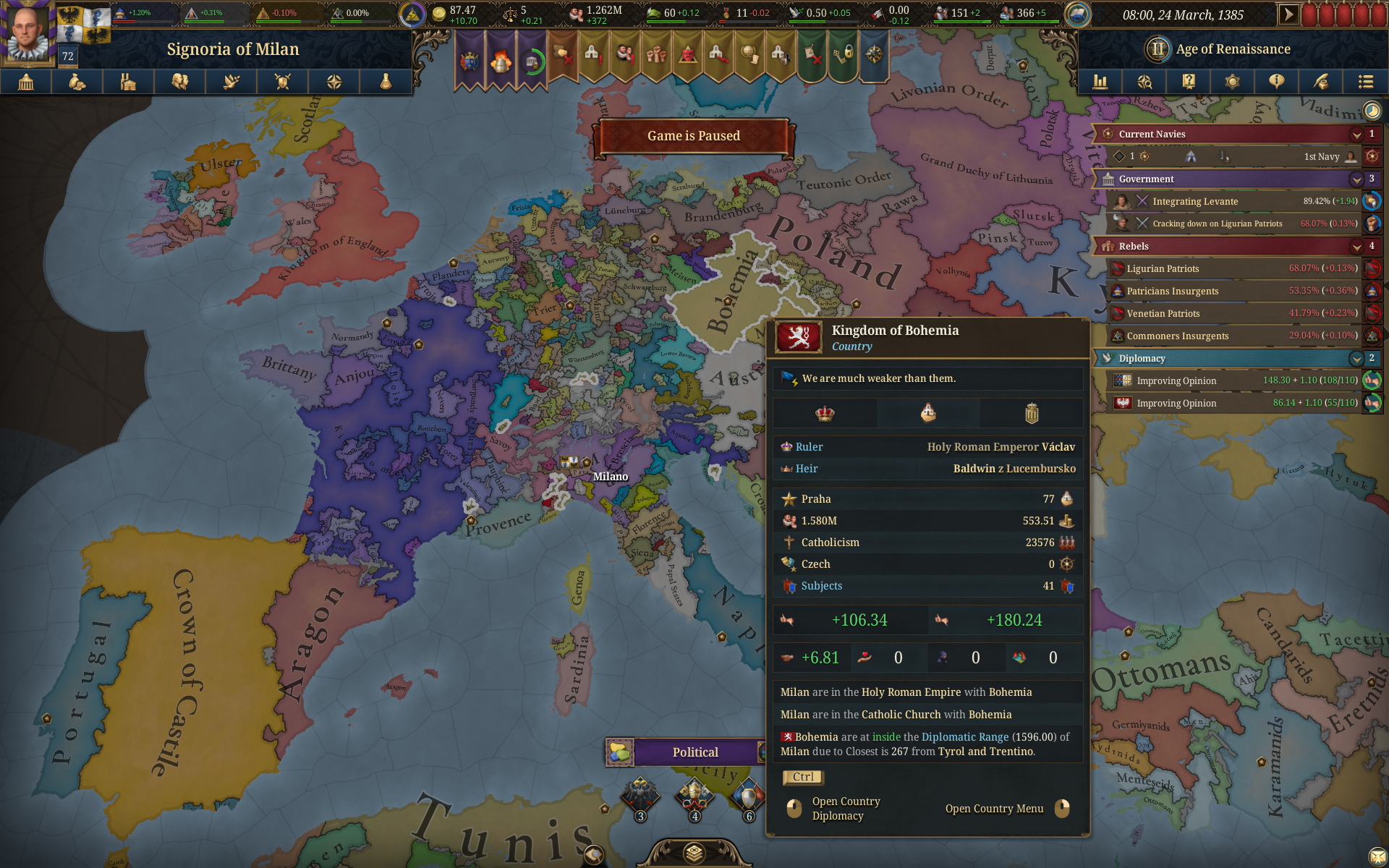 Очень чешутся руки уебать всяких микроцефалов соседей, благо есть оборонительный пакт какой то с Францией, но боюсь опять сидерть и дрочить по 30 лет одну провинцию чтобы не ебали повстанцы, приходится терпеть. А в это время Чехия уже колонизирует Флоренцию изо всех сил