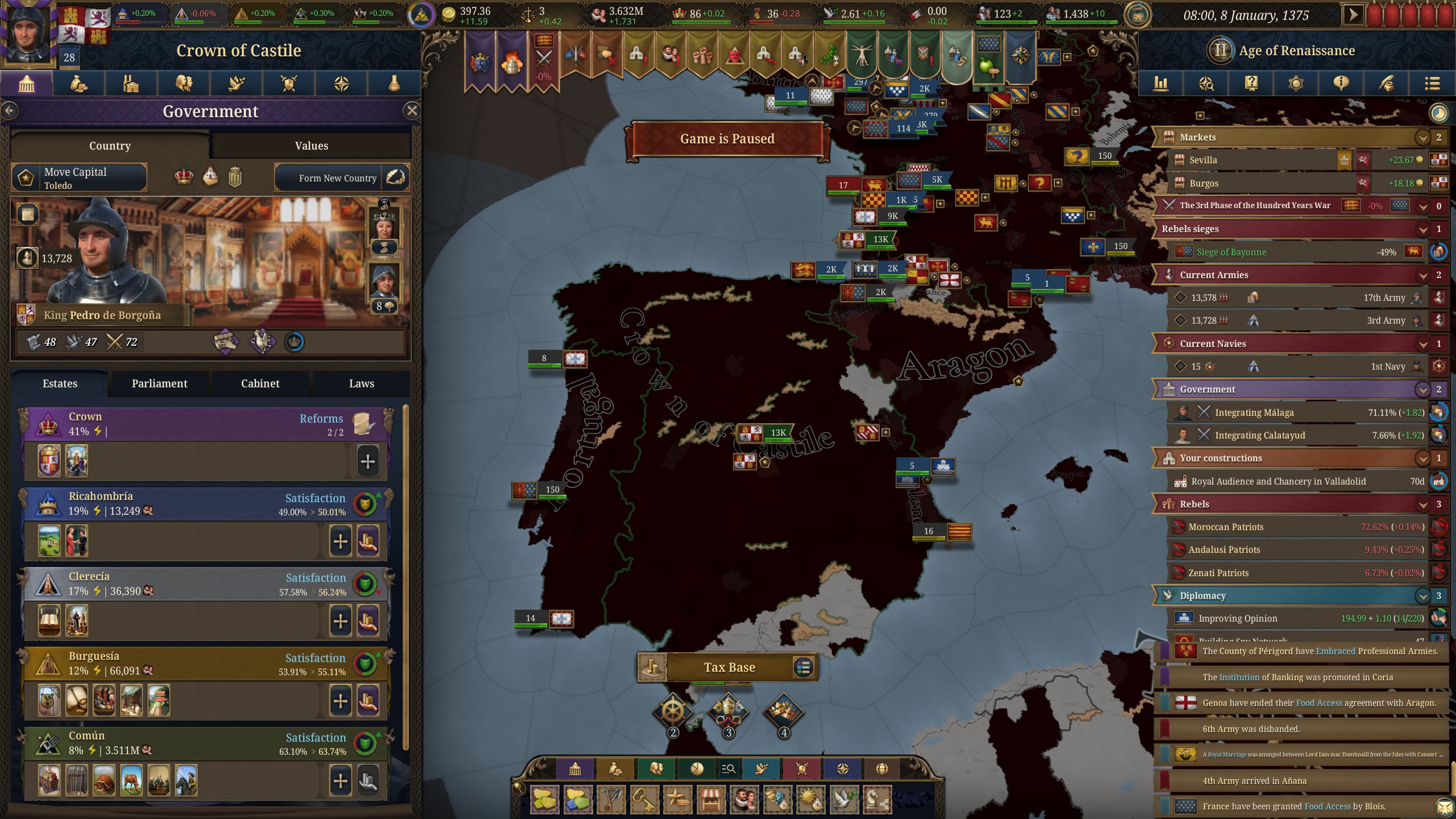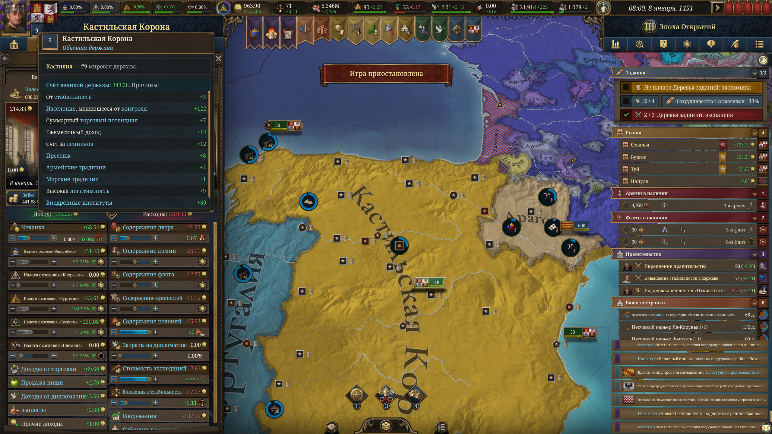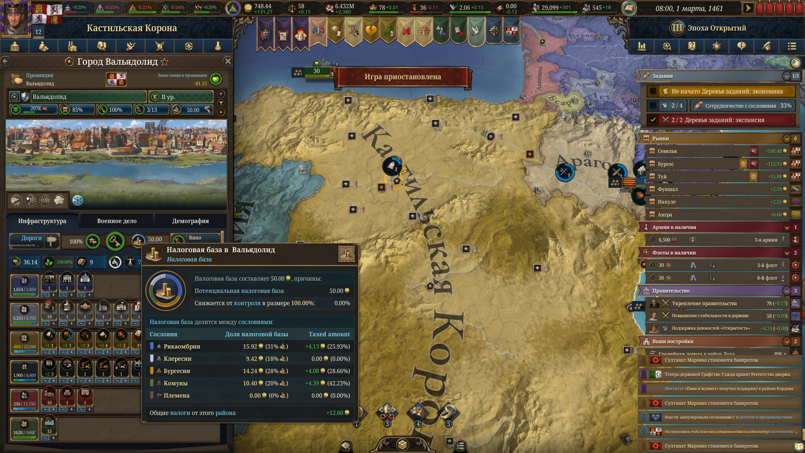 как за кастилию не сосать с деньгами? 1370 год, я в топе по населению, но доходов всего 50 дукатов тотал, при этом налоги выкручены на максимум для бургеров (но с них капает только 3 дуката) и пезантов. Ноблы негодуют, с них налогов по минималке, тоже где-то три дуката. Но я смотрю на леджер, я даже не в десятке по инкаму. Смотрю на соседей - они домиками радостно застраиваются, а у меня баланс околонулевой, любой негативный эвент отправляет займ брать.