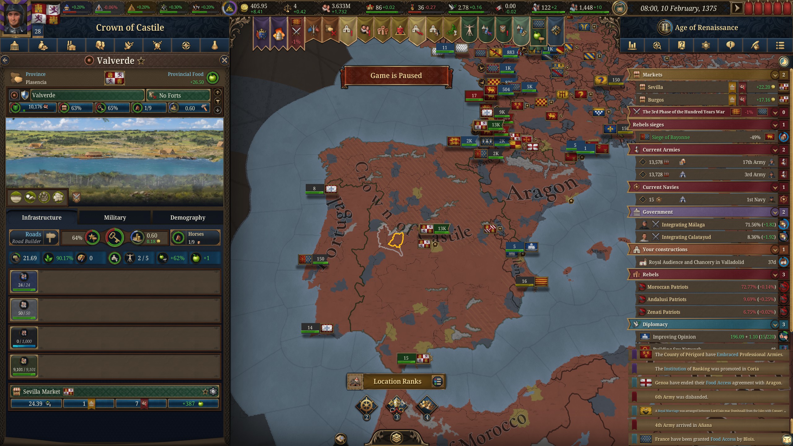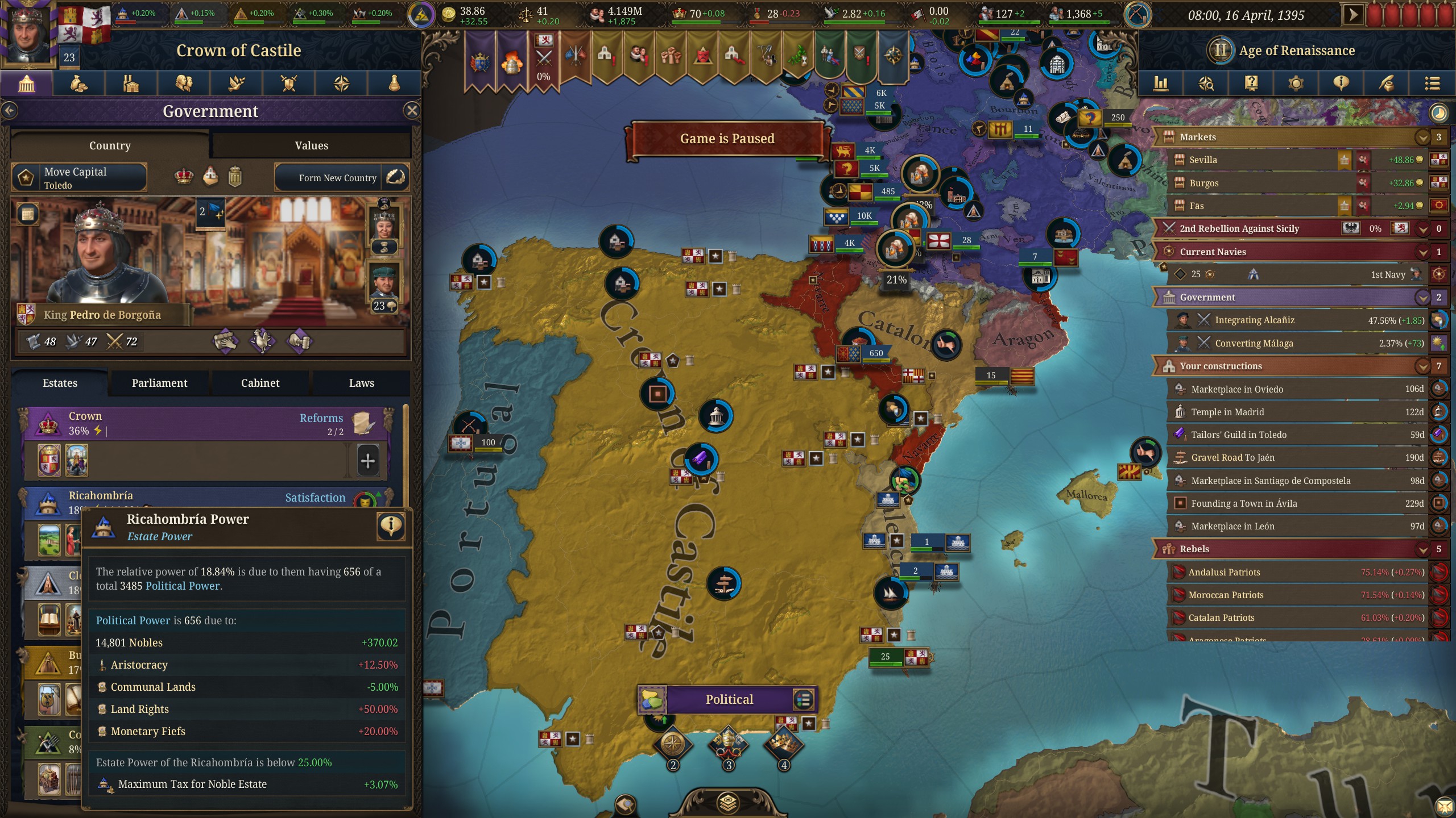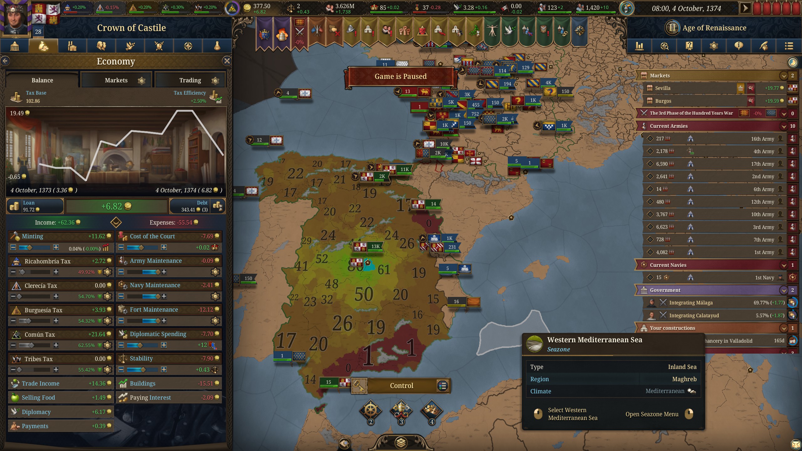 как за кастилию не сосать с деньгами? 1370 год, я в топе по населению, но доходов всего 50 дукатов тотал, при этом налоги выкручены на максимум для бургеров (но с них капает только 3 дуката) и пезантов. Ноблы негодуют, с них налогов по минималке, тоже где-то три дуката. Но я смотрю на леджер, я даже не в десятке по инкаму. Смотрю на соседей - они домиками радостно застраиваются, а у меня баланс околонулевой, любой негативный эвент отправляет займ брать.