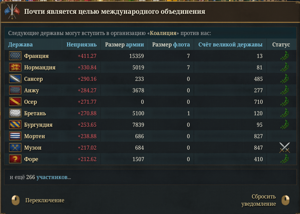 Париж за 3 дня 8 лет Механика подчинения франции душновата, нужно иметь больше очков ВД чем они, чтоб навязать унию Но единственный способ обойти это жрать подсосов франции По итогу меня ненавидит половина европы, а первая коалиция из 1/3 сри в меня уже влетела когда дожимал француза И теперь 12к (потому что островные подсосы нихуя не делают) против 100к, да ещё и усталость продолжает капать