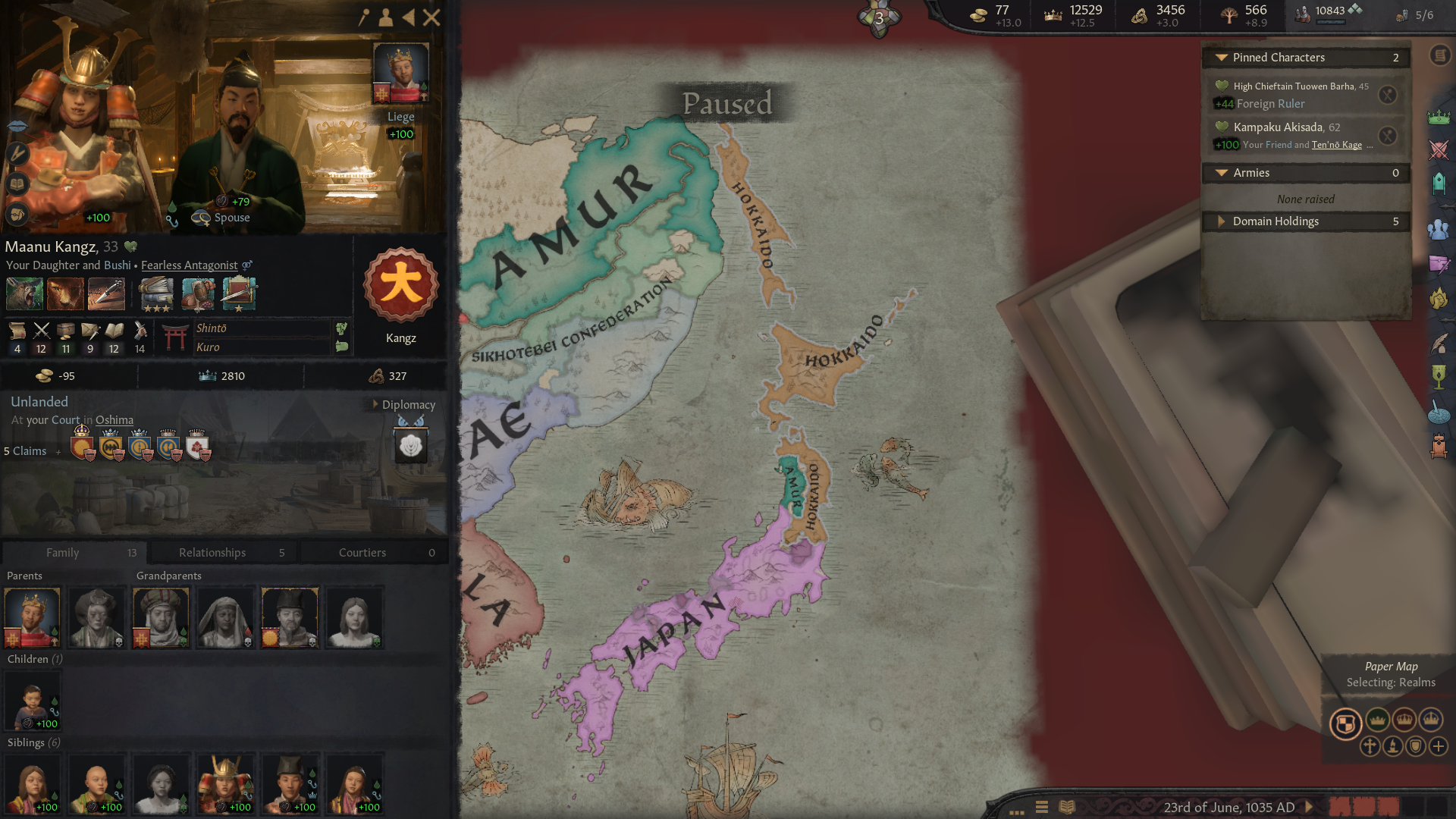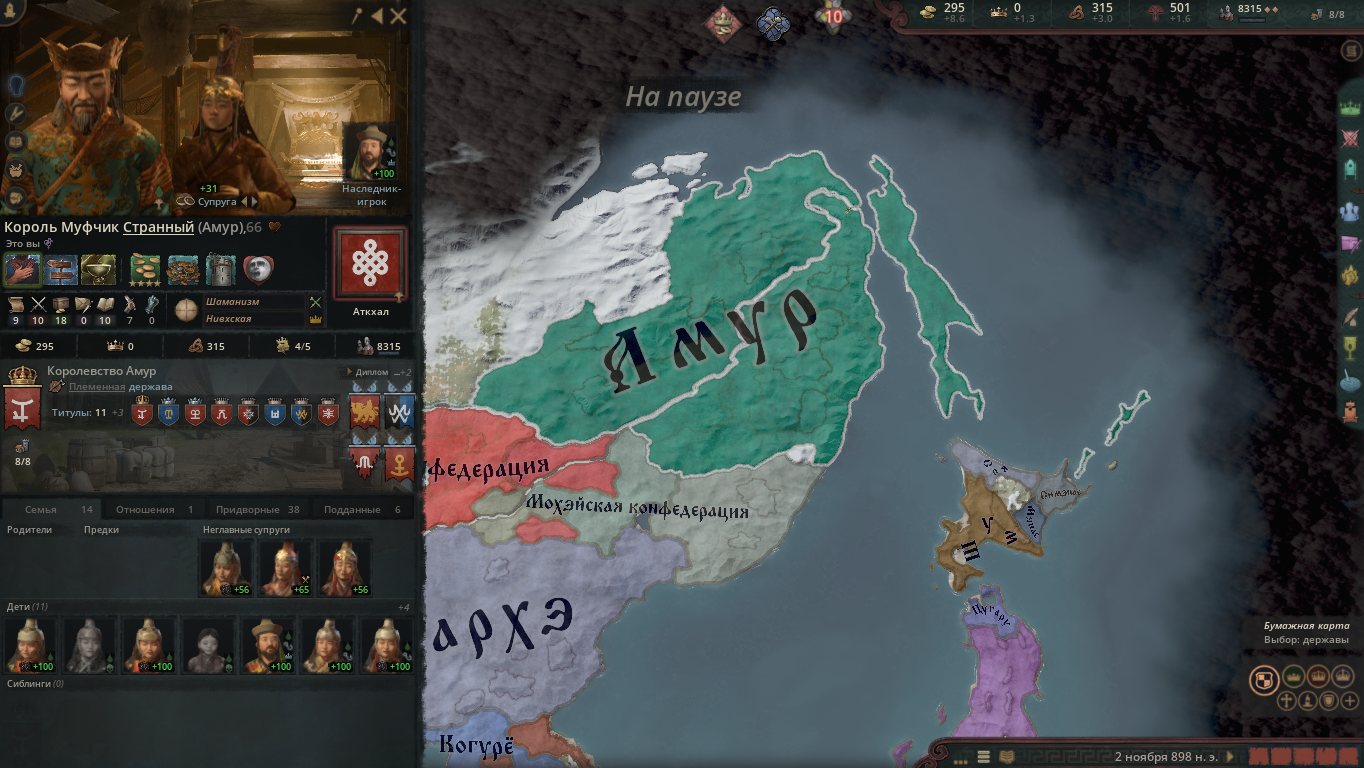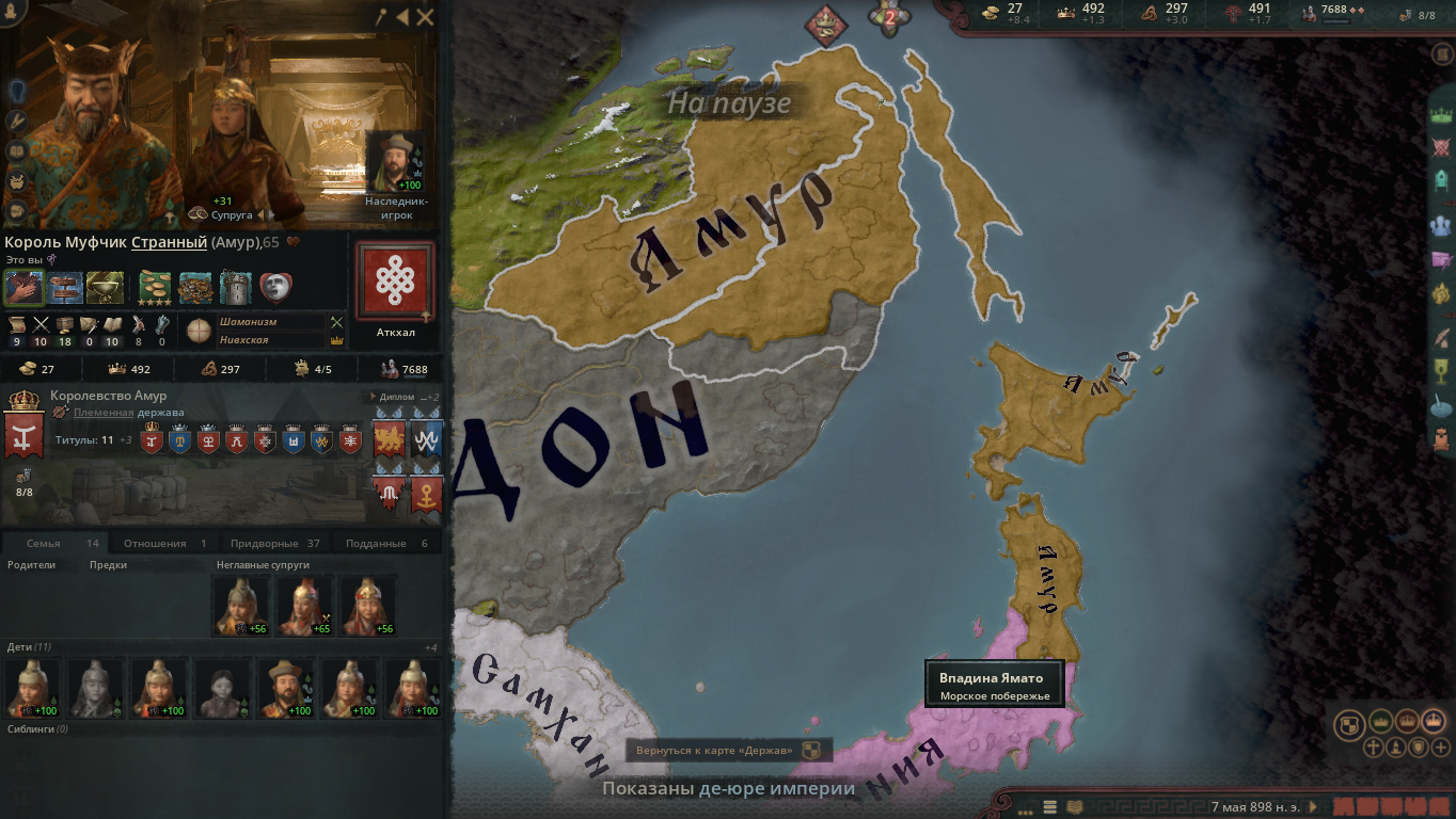 Добрались чтобы понять что в японии не сегунат, а припизднутая форма административного правителства. Я попытался получить землю через женитьбу. Но там наследники земель меняются так быстро и рандомно что пиздец. Даже разбираться не стал. Принял синтоизм и пошел к айнам и отжал у них землю. Снарядился, захватил три герцогства. И создал королевство хоккайдо, состоящее из собственно из острова хоккайдо, острова сахалин и небольшого куска самой японии, который хз почему каким-то челам принадлежал рандомным. Дальше несколько поколений гриндил ресурсы и дипломатию. Отжать что-то у японии довольно сложно. Они плавают туда-сюда. У них самураи ебашат сильно и армия по численности и качеству превосходит то, что пишет подсказка при наведении мышкой. При 5 тысяч в окне начала боя, они умудряются 10 высирать где-то. Еще и замки ебейшие на каждом милиметре, которые осаждаются с моими африканскими осадными орудиями по несколько лет. В какой-то момент я смог еще и амур отжать, сделать королевство, которое потом отлетело с чудесным конфидеративным разделением, в целом похуй было, они союзники, но чуть позже это небольшую свинью подложило.