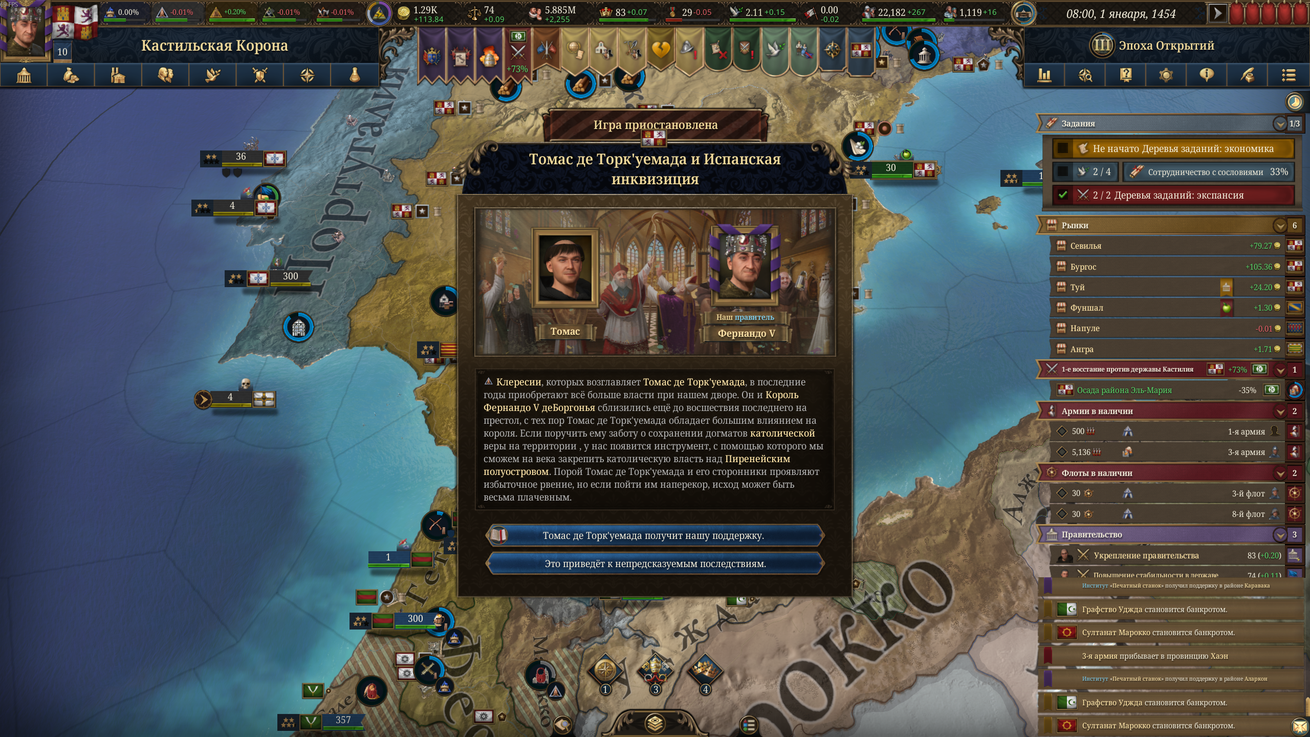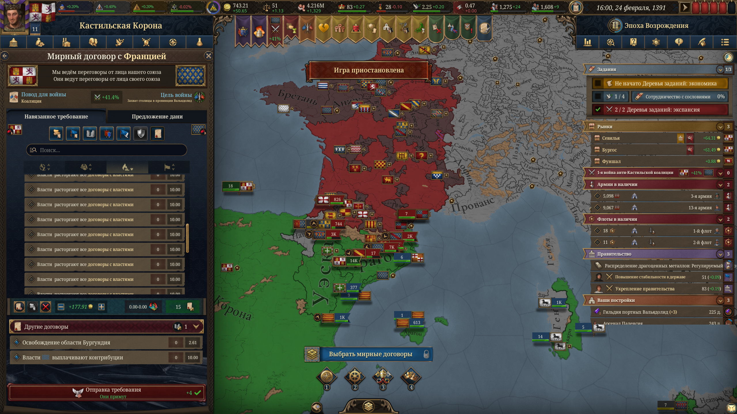 >>50430540 Бля, надо было тебя послушать и вступить в союз с Францией. Я, конечно, не вступил в союз с Англией, но самостоятельно освоил почти всю Иберию, кроме Наварры, а также половину Марокко. И эти пидарасы создали коалицию и напали на меня.