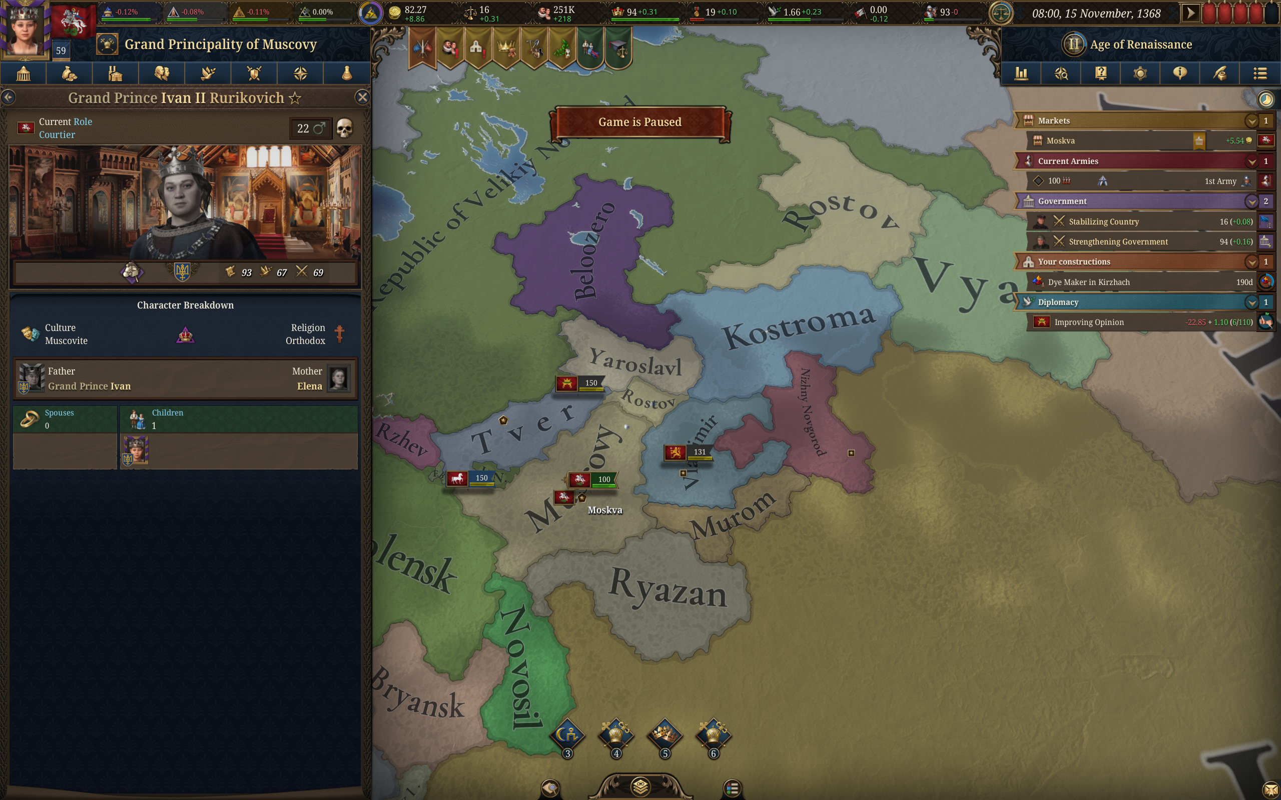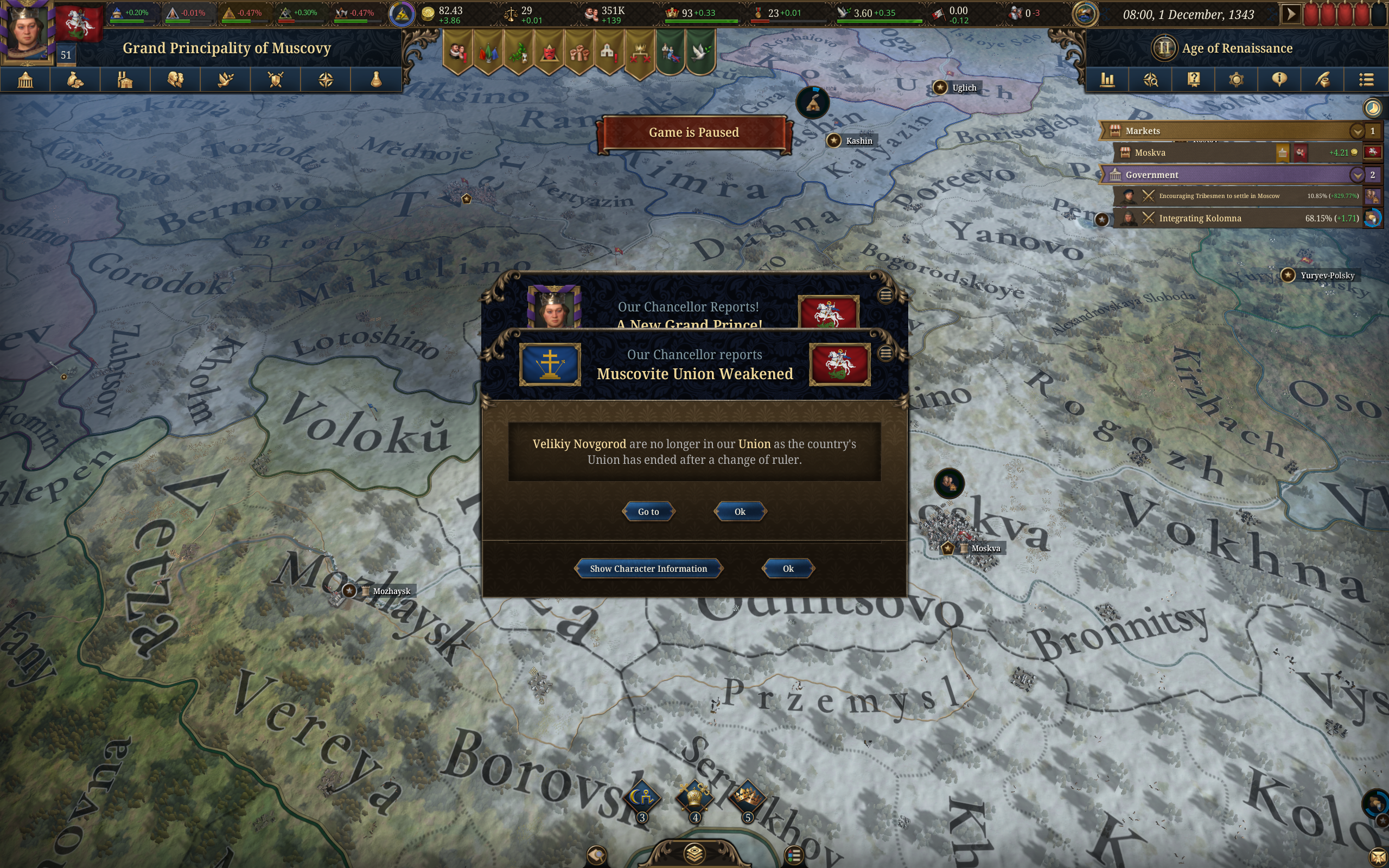 Лично мне остаются непонятным две вещи. Когда выгодно оставлять территорию с 0 контроля для себя(когда хочешь торговать руками чтобы институт с другого рынка перетекал к тебе?) С какого уровня контроля стоит начинать интегрировать вассалов чтобы было выгодно? Если после интеграции на их земле будет минимум 50, 80% контроля? 20 вассалов в наличии. Ещё не доиграл до 1500