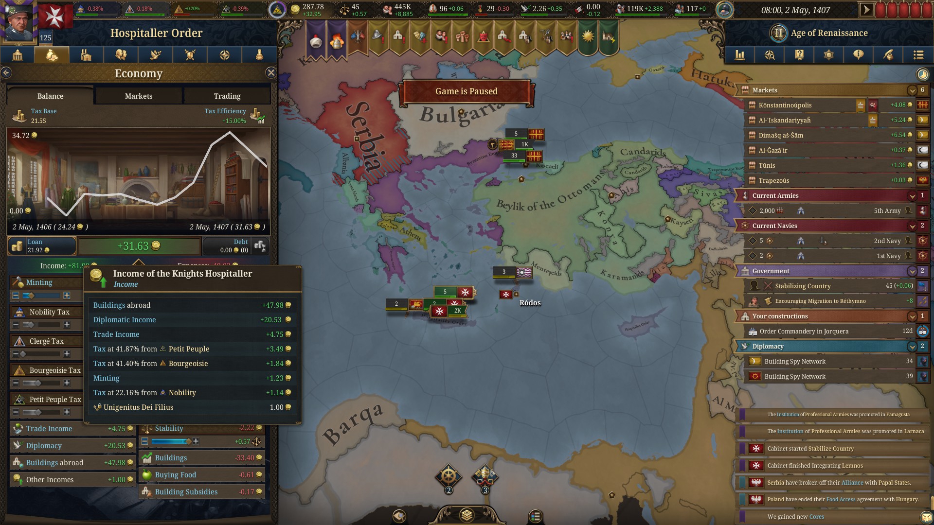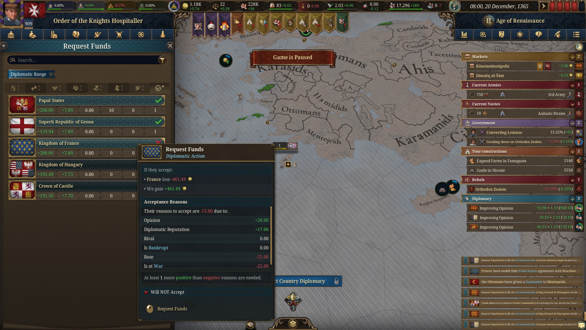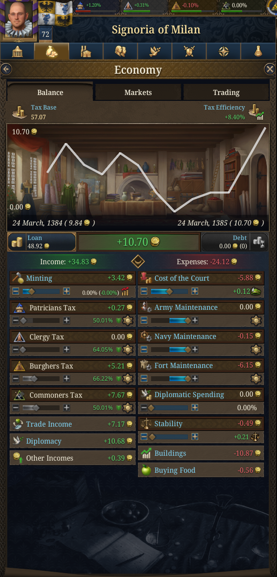 построил домики в столице, так как контроля нигде нет. Контроль как я понял здесь как автономия в прошлой части, только какие то анальные ограничения на него. Так что застраивал только Милан сам. Еще в планах развести на favors Францию, она даст целых 400 монет, это как мой доход за 60+ месяцев, вообще кайфону, построю домики на все деньги.