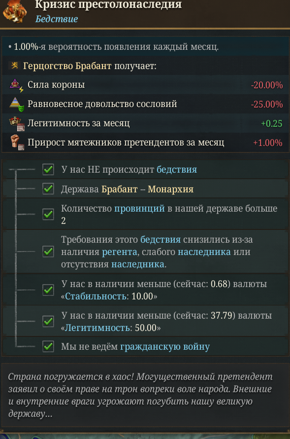 >>50422022 У меня ещё и правитель конченая мразь: -эмбеззлер на -5% такса -трусливый на -5% морали армий -эрратик на -10% легитимности (и каждые несколько лет эвент на -5 легитимности) -конфузинг на -2 дип реп