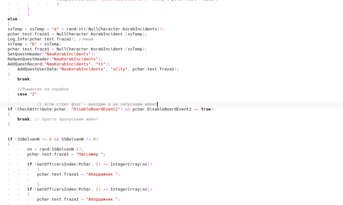 case "disable_event2": pchar.DisableBoardEvent2 = true; Log_info("Вы свободный капитан.") dialog.text = "Только я кораблем командую."; Link.l1 = "Вот и славно. Вот и хорошо."; Link.l1.go = "exit"; break; Что думаете?
